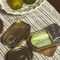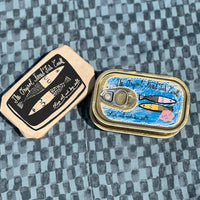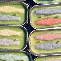 We love these little tinned fish candles, hand-poured from soy wax that mimic sardine cans. The magic begins as you peel back the tin lid, revealing a whimsical scene reminiscent of actual sardines in a tin. Dive into a sea of vibrant fish shapes elegantly suspended in olive oil-colored wax. As the gentle flame flickers, a delicate aroma of sea salt fills the air.