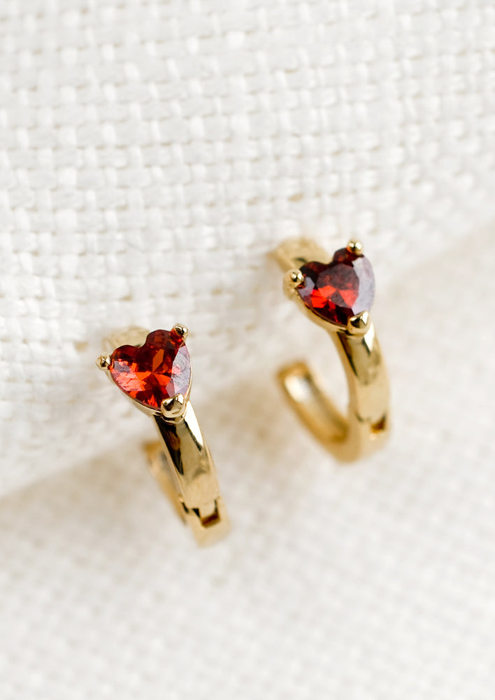 Red crystal hearts in ruby red adorn these petite golden huggie hoops, ready to spread a little love any day of the week.