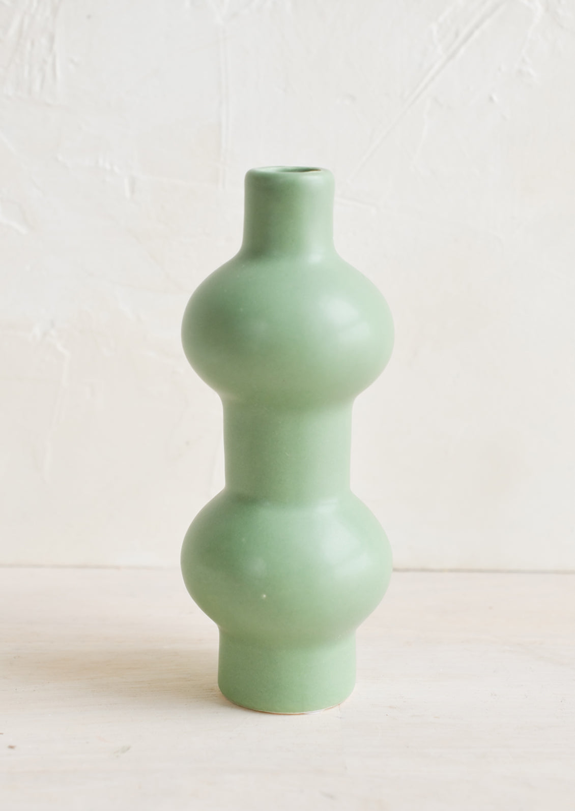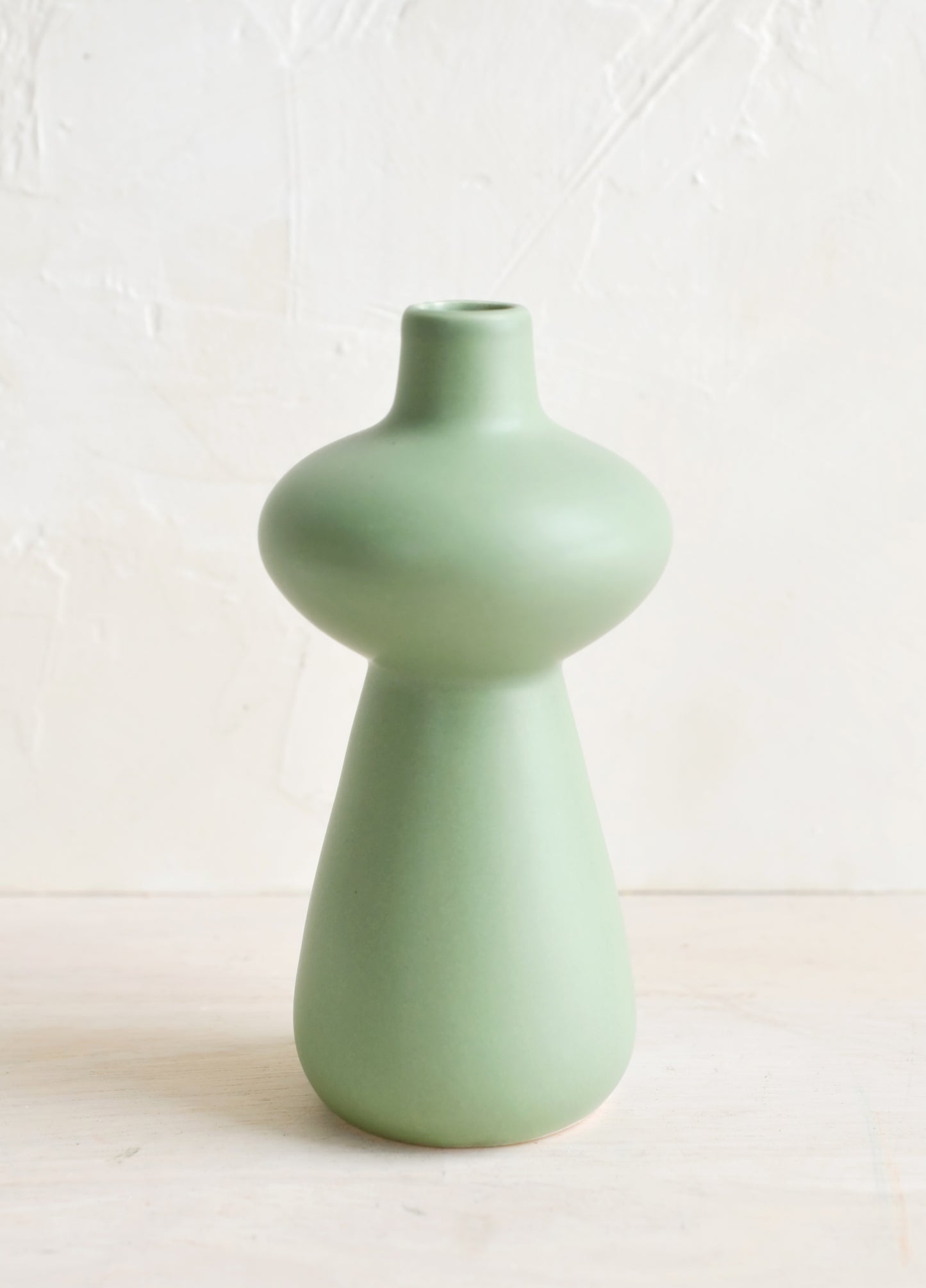 Flaunting quirky curves, this ceramic bud vase flaunts a serene hue and a cool matte finish—it's the perfect size for a single dramatic stem or a handful of wispy greenery.