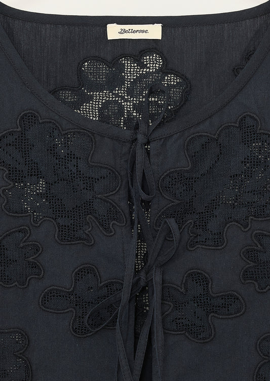 • A woman wearing a sleeveless tie front top in black with tonal lacework detailing and peplum hem.