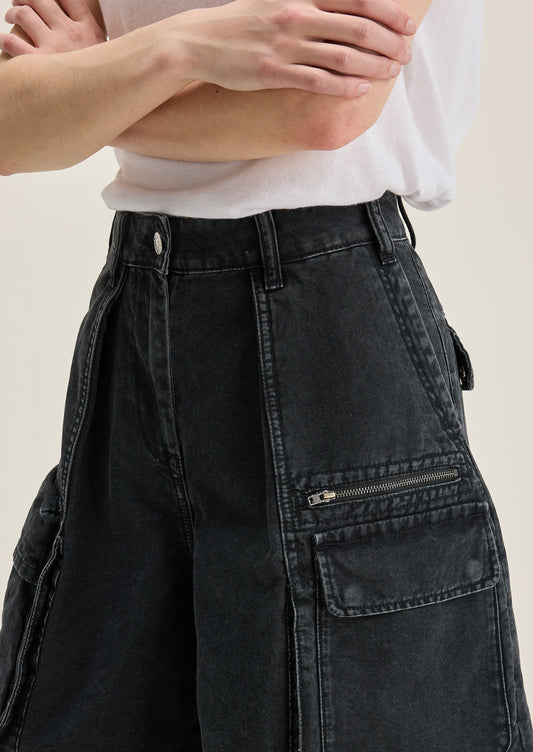 • A person wearing a pair of wide leg denim shorts in charcoal wash.