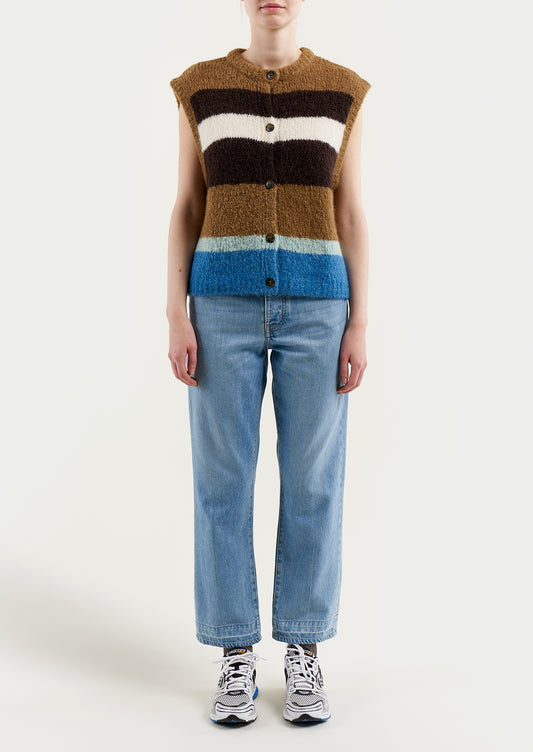 • A woman wearing a sleeveless, button front sweater vest in brown and blue stripes.