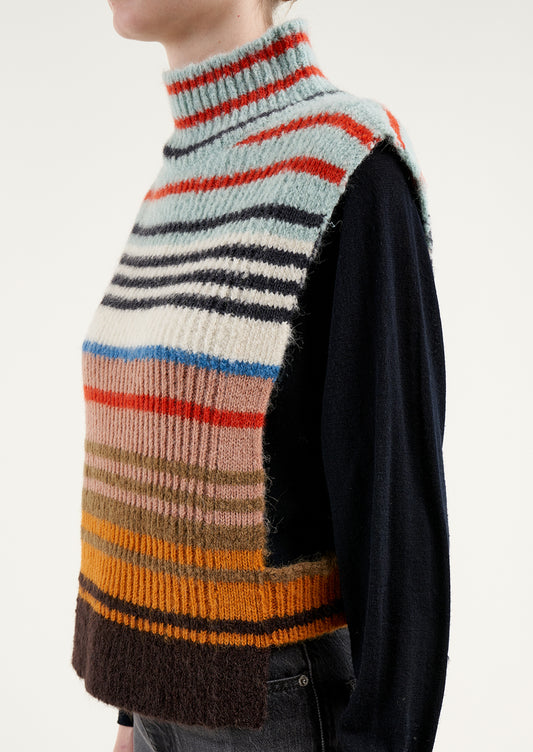• A person wearing a sleeveless turtleneck sweater in multicolor stripe.