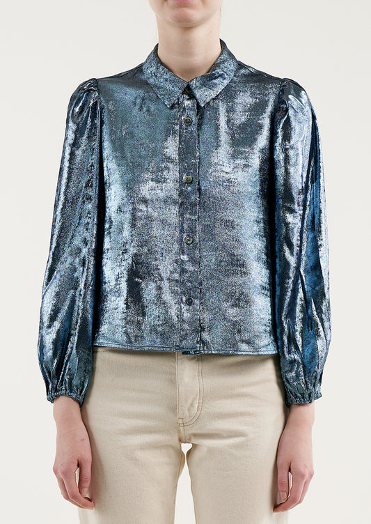 • A woman wearing a crinkly textured blouse in ivory with navy check pattern.