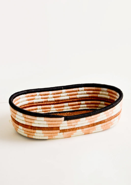 • Oval shaped shallow bread basket made from woven natural grass in black and terracotta geometric print
