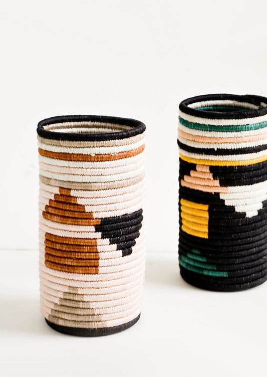 • Tall vases made of woven natural grass in colorful geometric pattern, with eucalyptus leaves inside