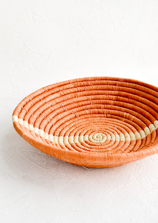 • A shallow woven pine needle platter with raffia pattern detailing.
