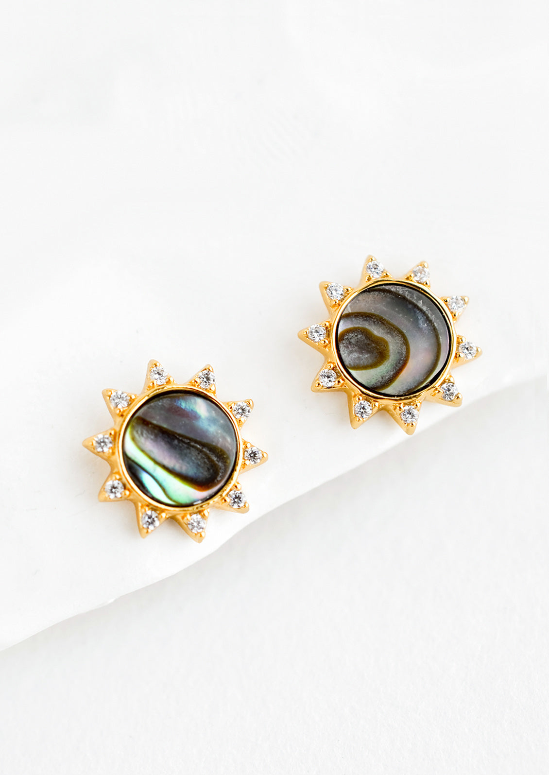 Inspired by the sun and sea, these sparkling studs take on a sun-shaped silhouette, centered around a shell inlay from the ocean itself—choose from natural abalone or mother of pearl, both surrounded by sparkling crystal sun rays.