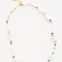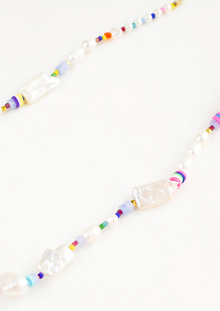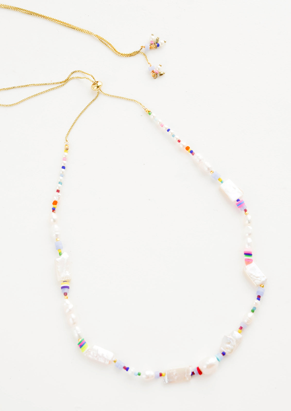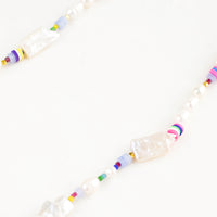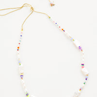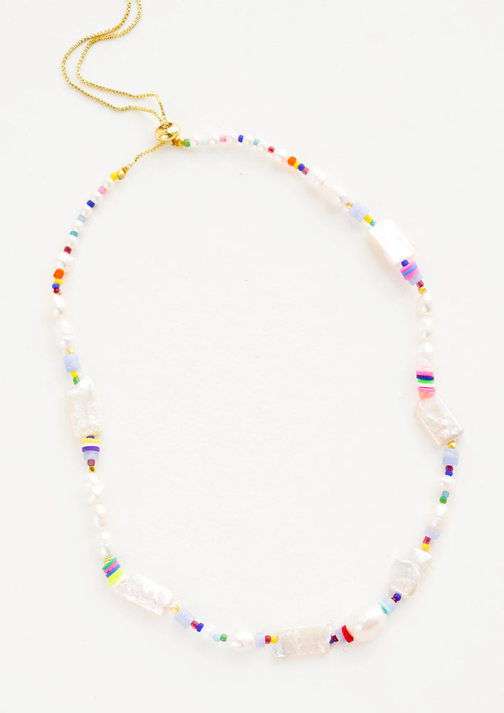 A mix of pearls in smooth, square and irregular shapes gives a youthfully quirky feel to this beaded necklace, dotted with colorful heishi and seed beads throughout. An extra long chain allows for an adjustable length from short to extra long.