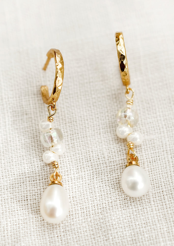 Iridescent glass beads and freshwater pearls dangle from a textured golden hoop on these delicate earrings.