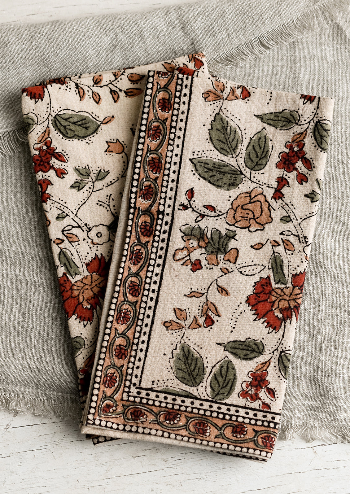 A color palette rich with warmth gives a sophisticated vibrance to these block printed napkins, precisely crafted by Indian artisans using traditional block printing techniques.
