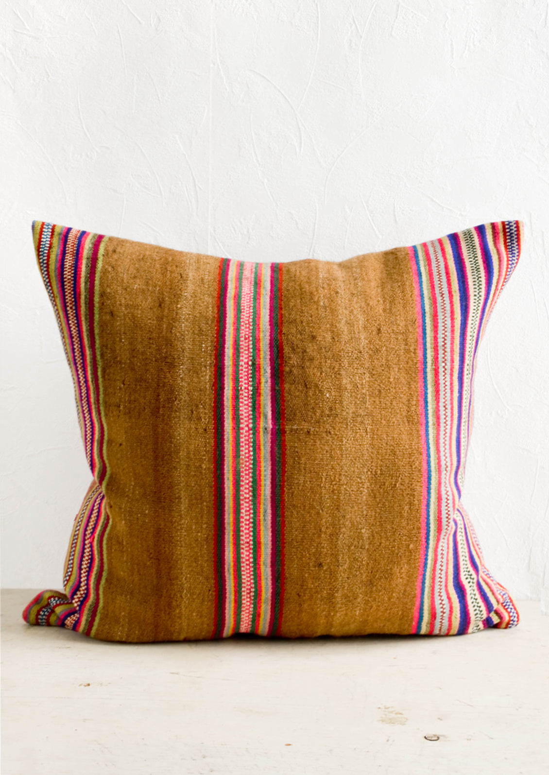 A traditional Andean textile, the aguayo is a rectangular textile used in traditional communities to carry children or small objects. Reinvented here in the form of a throw pillow using vintage aguayo fabric at least 30 years old, it features the same fabric on both sides.