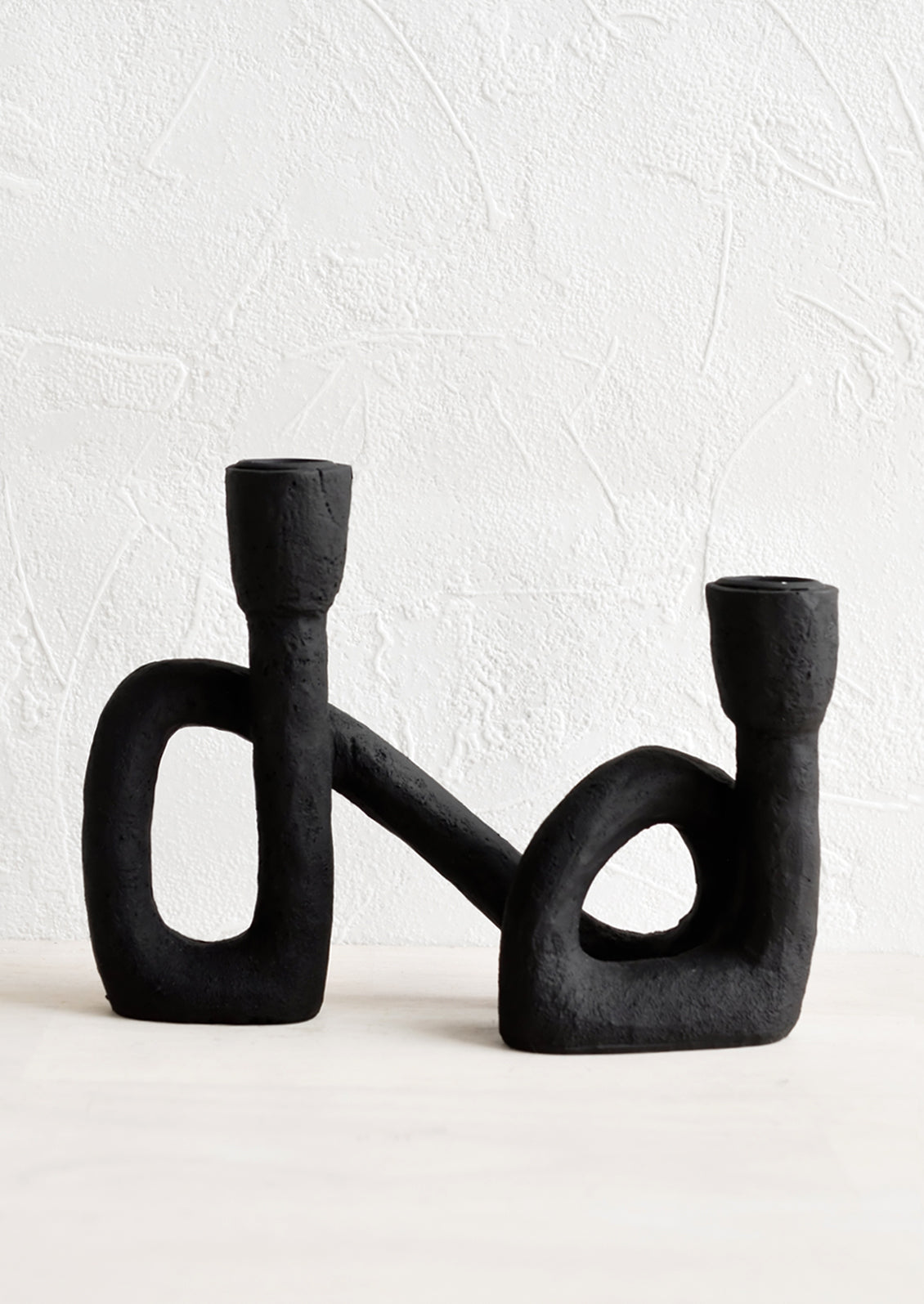 Twists and turns take on a moody look in jet black, showing off a matte, plaster-like finish—this dual taper candleholder feels simultaneously serious and a little bit playful.