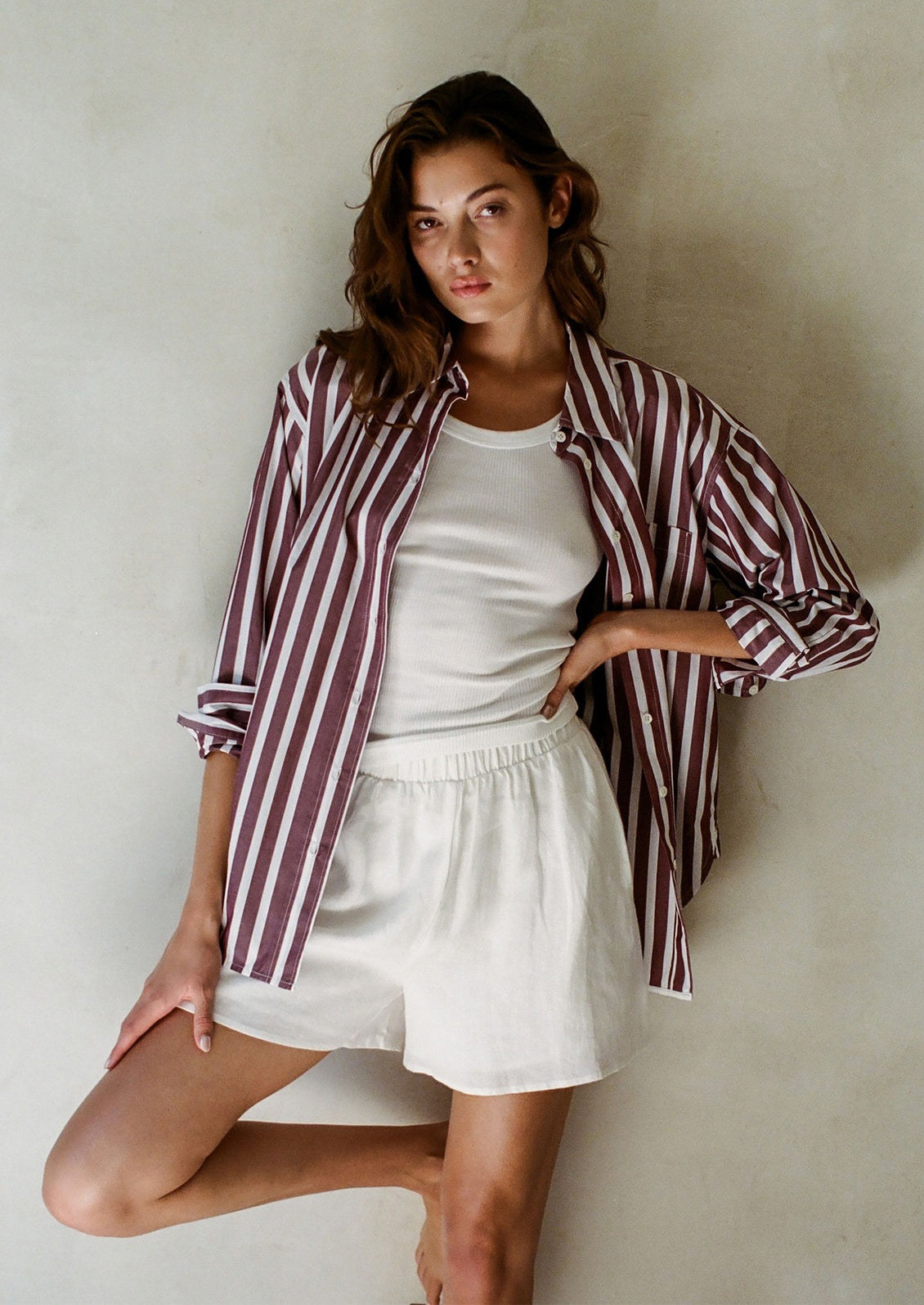 Perfectly oversized, this cotton poplin classic takes on a timeless stripe. Features button cuffs and a single patch pocket on the chest.