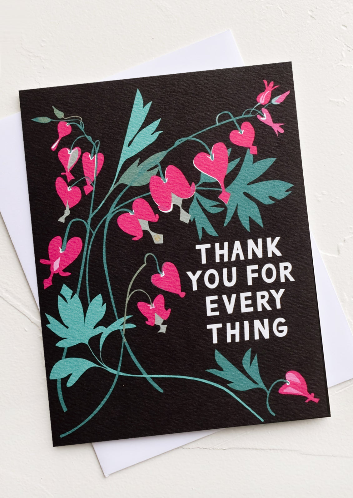 Beautifully depicting of one of our favorite plants, the bleeding heart, this dark-hued thank you card sends a grateful message with grace.