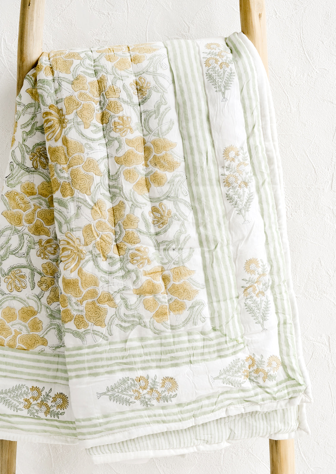 In a gorgeous palette of pale sage green and dusty yellow, this pastel-hued quilt shows off a block printed botanical print (with a contrasting stripe on the other side). An insulated fill provides cozy warmth.