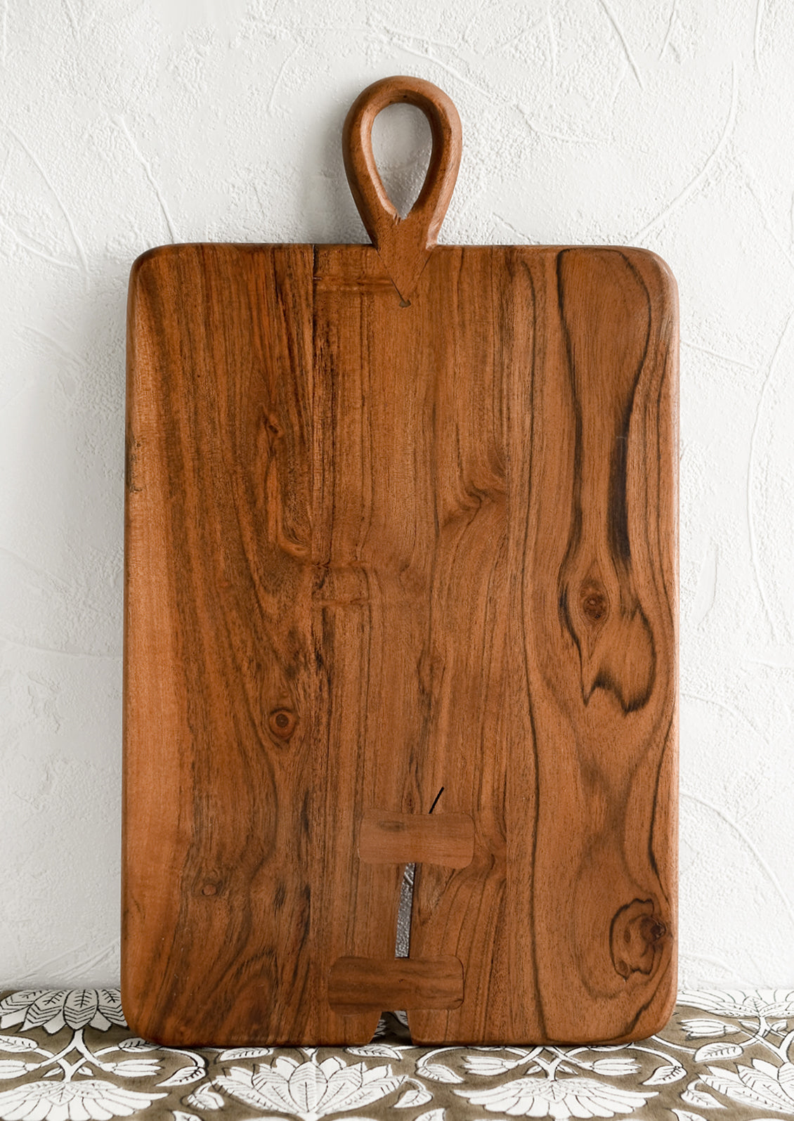 Acacia wood in a rich cherry stain gives a sophisticated look to this gorgeous cutting board, with a carved loop handle and bowtie inlay detailing for added character.