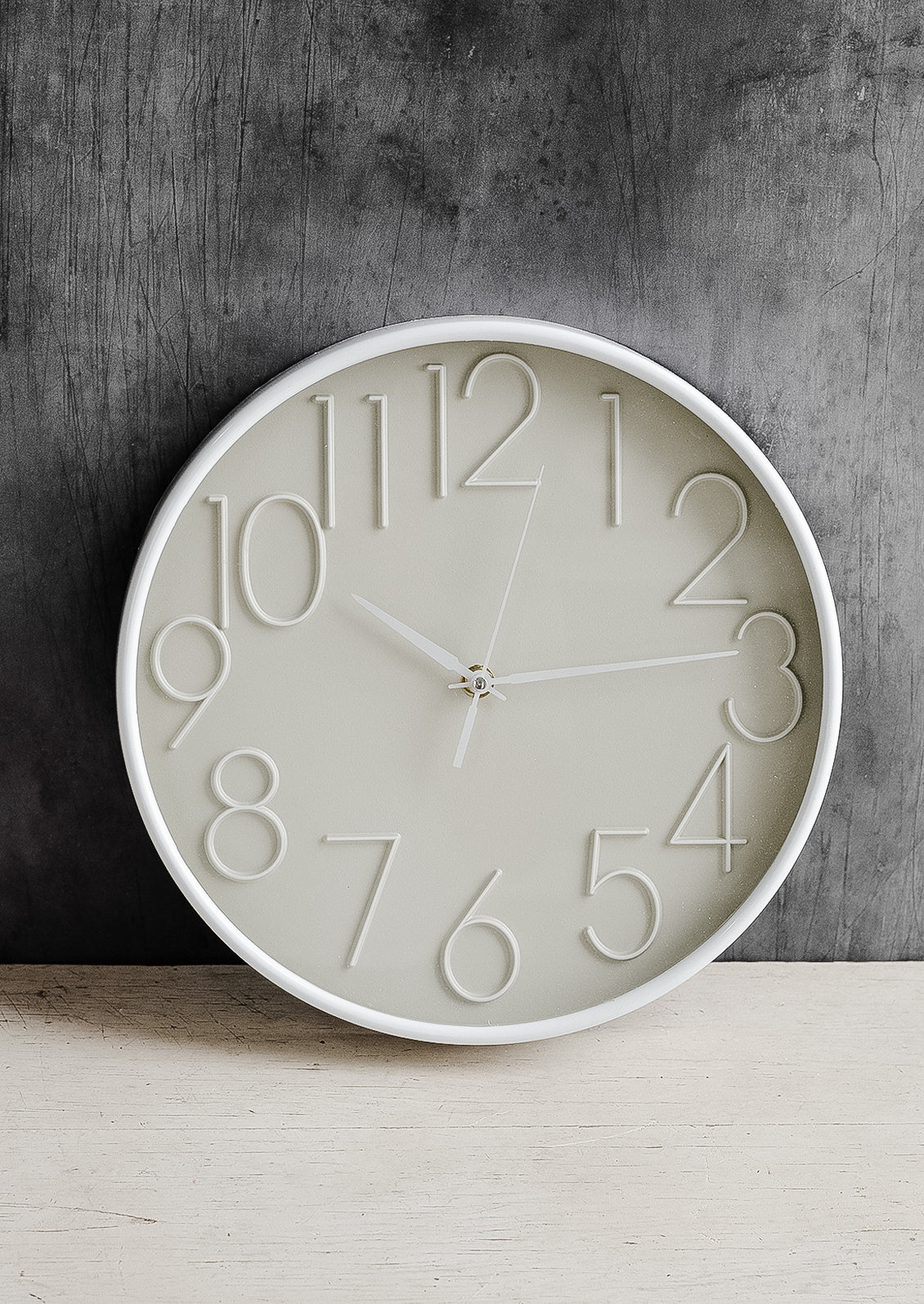 A smooth white rim and minimal, raised white numbers and hands give a strikingly modern look to this neutral wall clock.