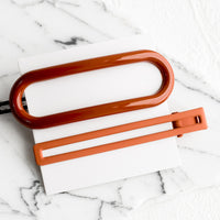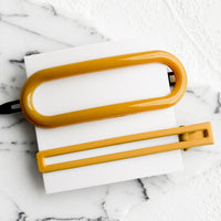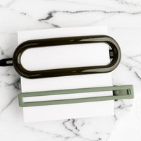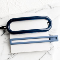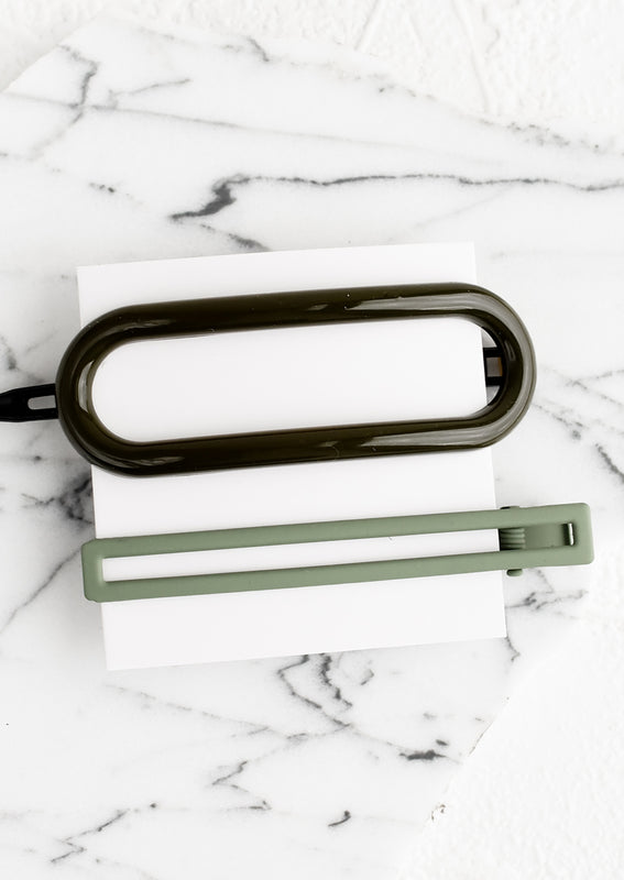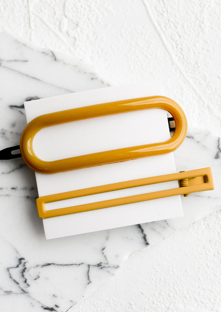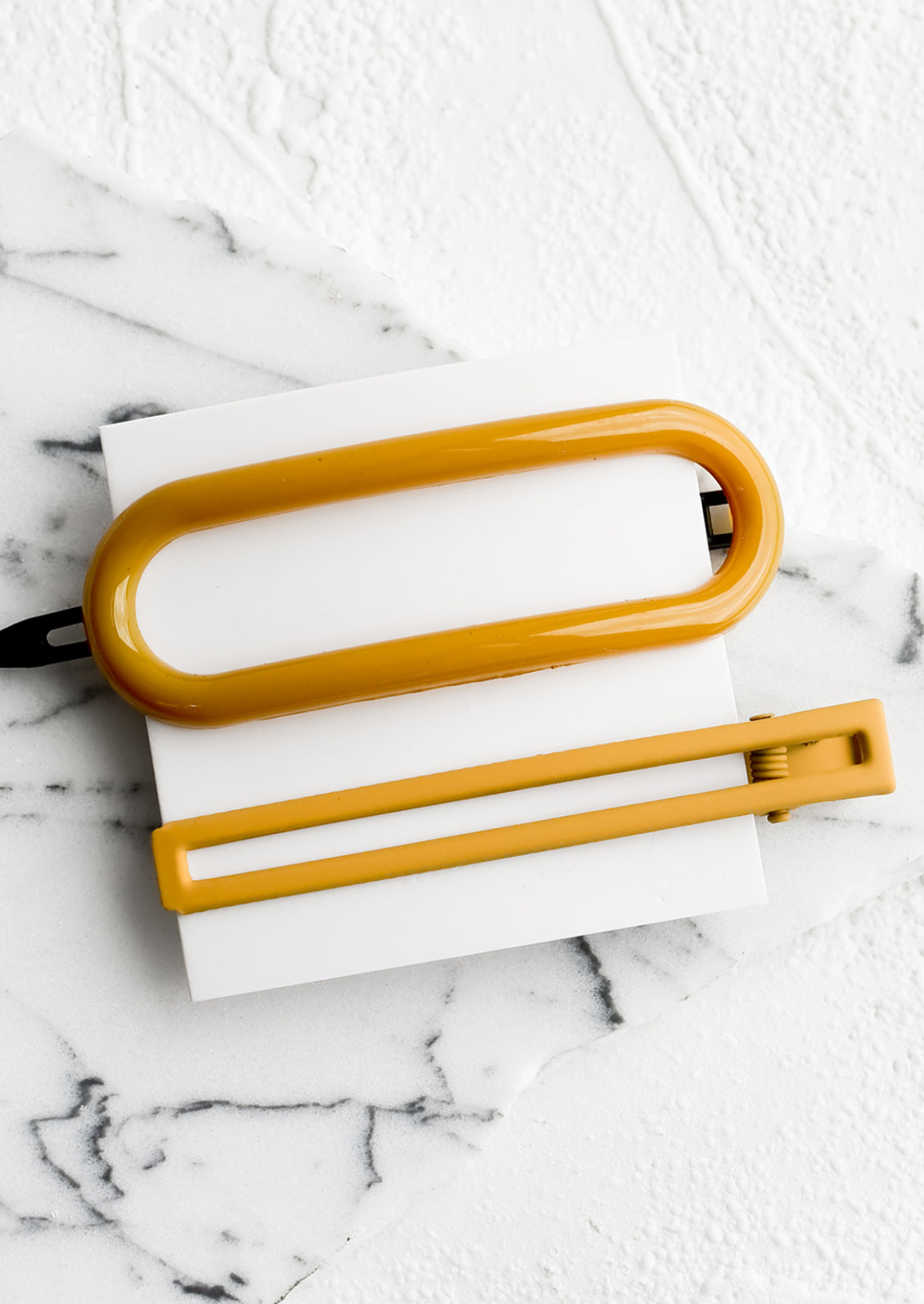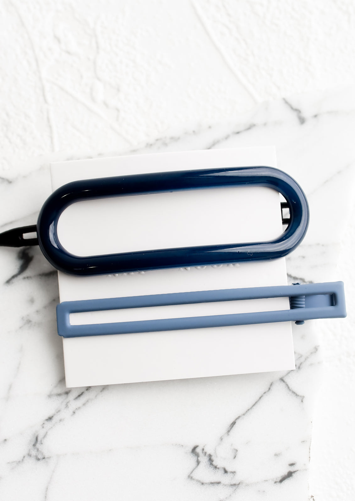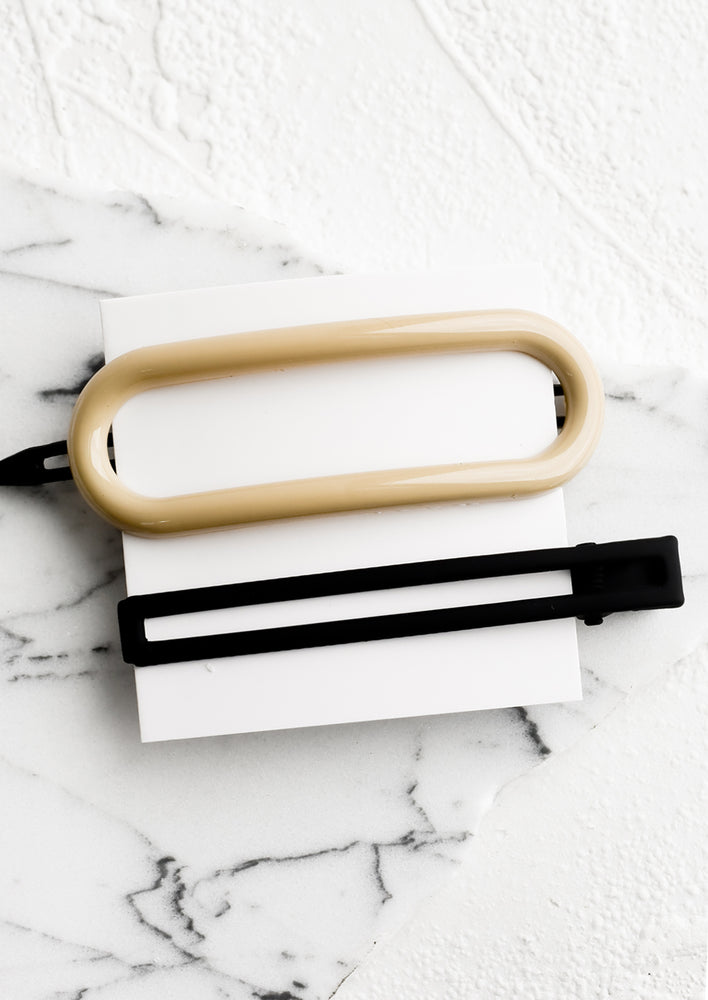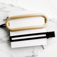 An oval-shaped clip in a glossy finish is juxtaposed alongside a soft-touch, rectangular silhouette in a complementary hue in this timeless pair of hair clips. From Nat + Noor.