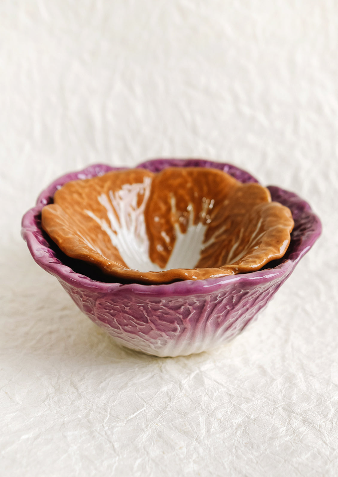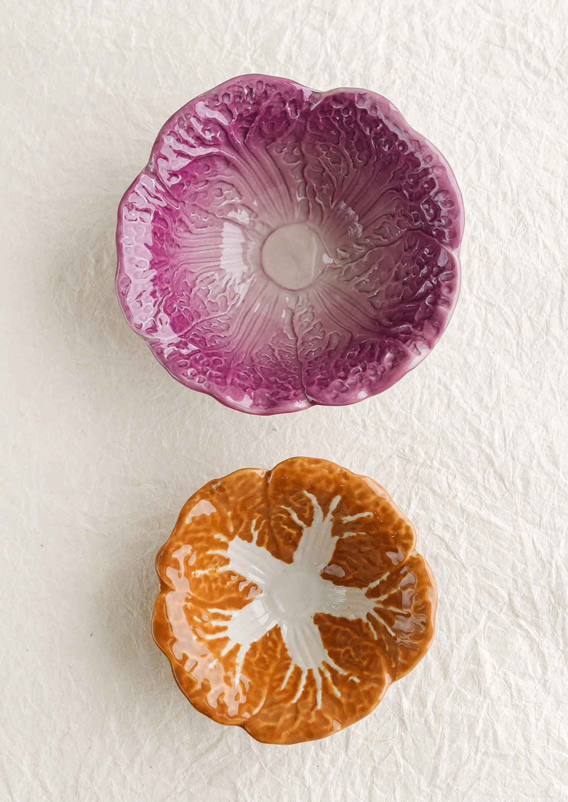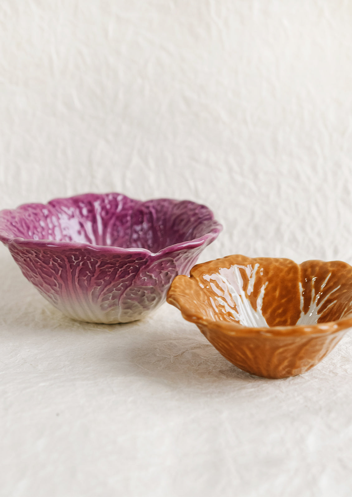 In hand-painted ceramic, these vintage-inspired bowls are a reissued spin on cabbageware popular in the 1960's. Purchase individually to use for serving or kitchen prep, or one of each style to make a coordinating pair.