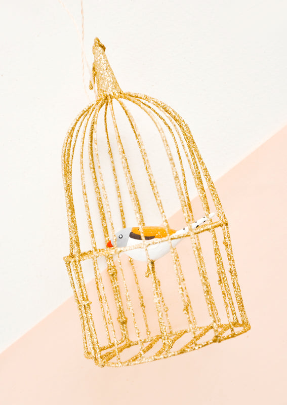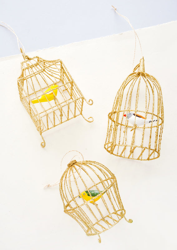 Singing songbirds chirp from within gilded, golden cages (complete with tiny little doors!), showing off their colorful plumage to curious onlookers.