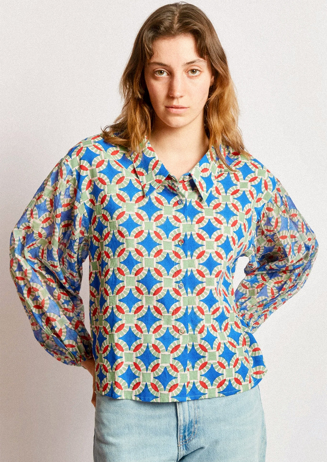 | Details | Collared neckline with button front closure Semi-sheer sleeve fabrication Elastic cuffs at the end of sleeves |