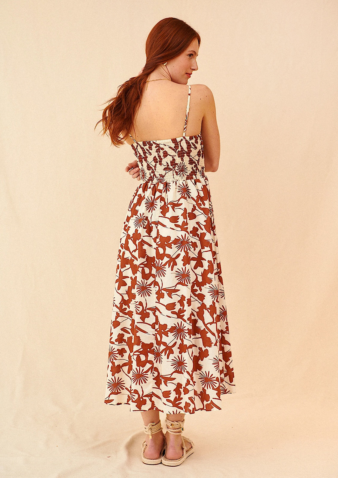 With a smocked, elastic bodice and adjustable shoulder straps, this printed cotton dress provides an easy, breezy fit.