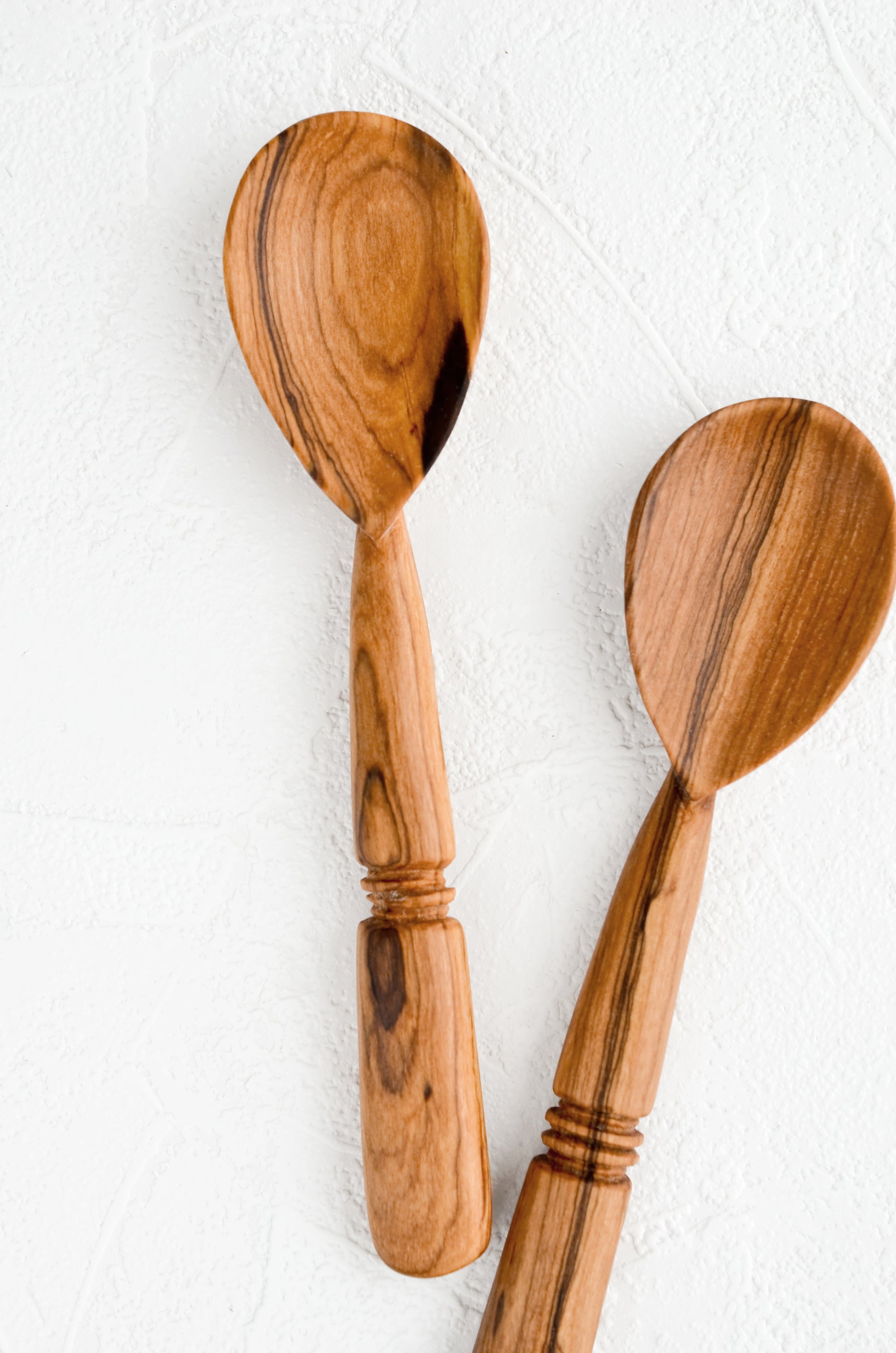 A hand-carved, banded detail gives rustic character to this handmade olive wood spoon, perfect for cooking and serving alike.