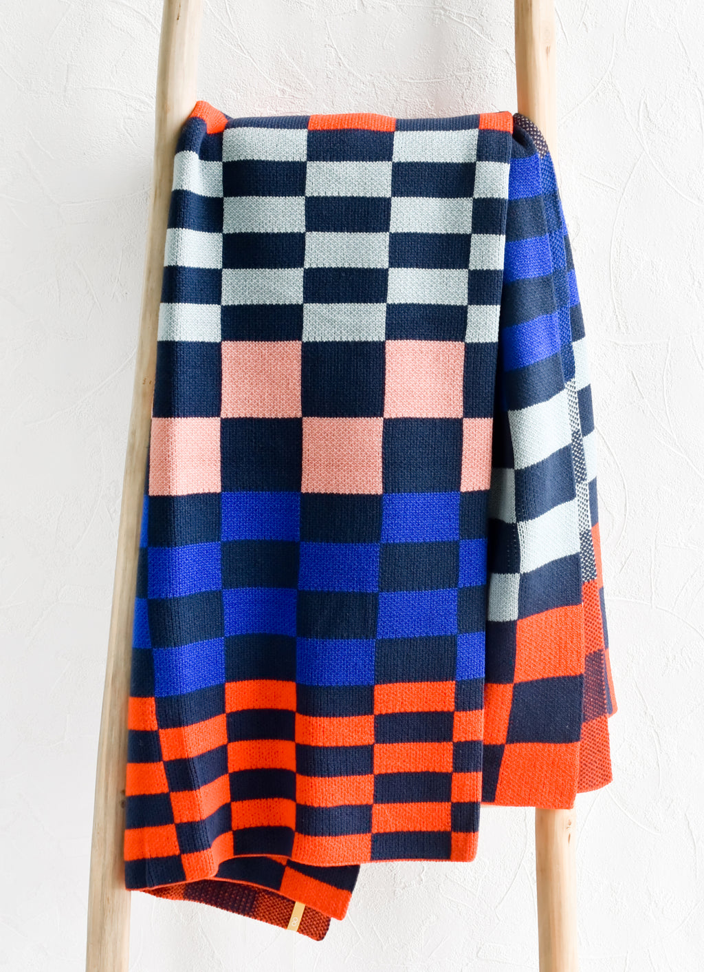 Made using repurposed deadstock yarn, this sweater-knit throw shows off a checkered pattern in a playful palette.