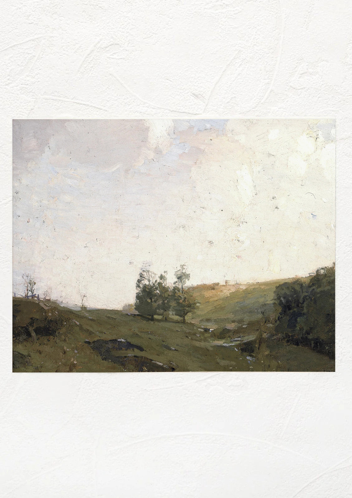 A reproduction of a vintage painting, this landscape art print depicts a pastoral scene of rolling hills and the sun peering through the clouds.