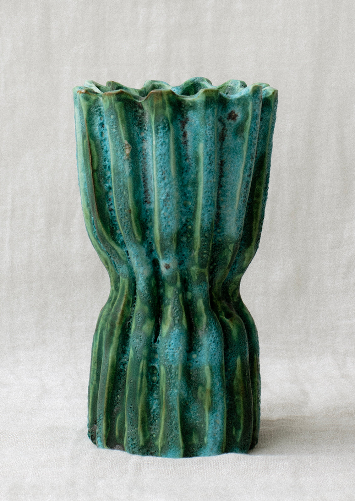 In a hand-mixed glaze incorporating copper, giving it its fantastic vibrant color and rich texture, this sculptural vase shows off a pleated, sea creature-like form. From ANK Ceramics.