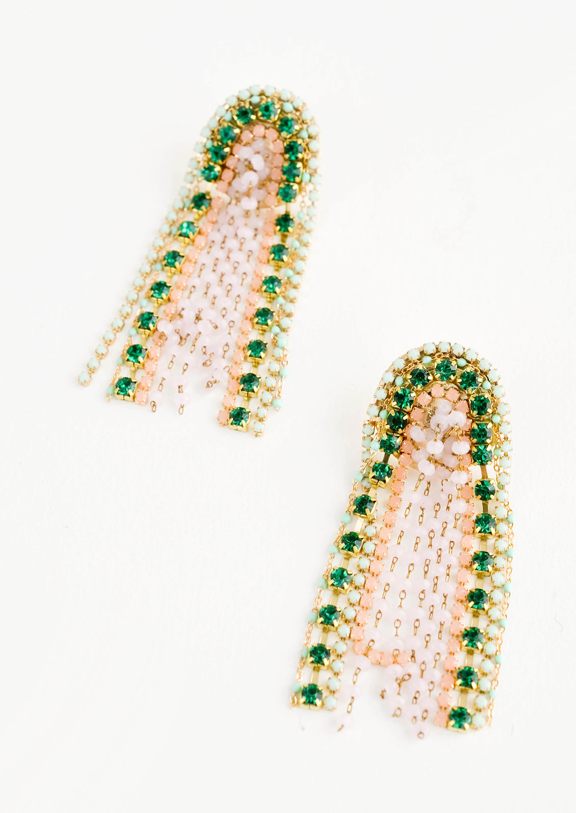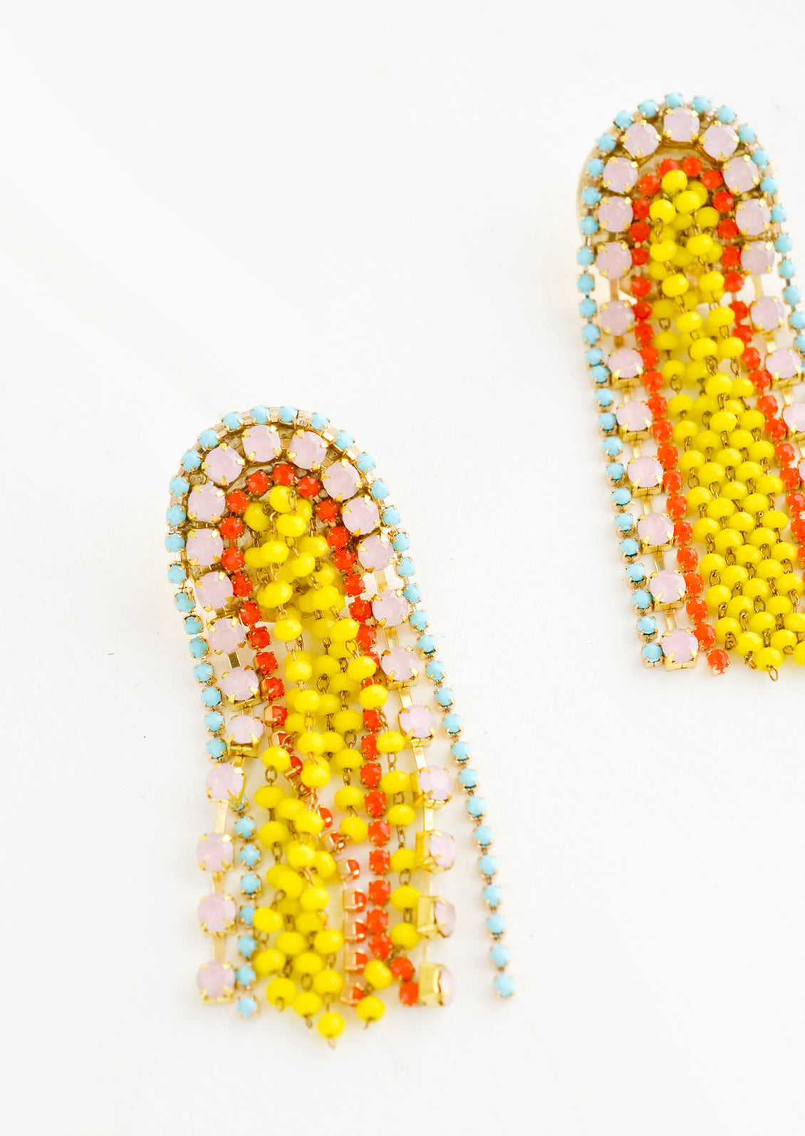 Cheery, welcoming rainbows are covered in colorful beads and crystals on these sparkling, party-ready earrings—a finishing touch for a special occasion, or a playful contrast to casual jeans and sneakers.