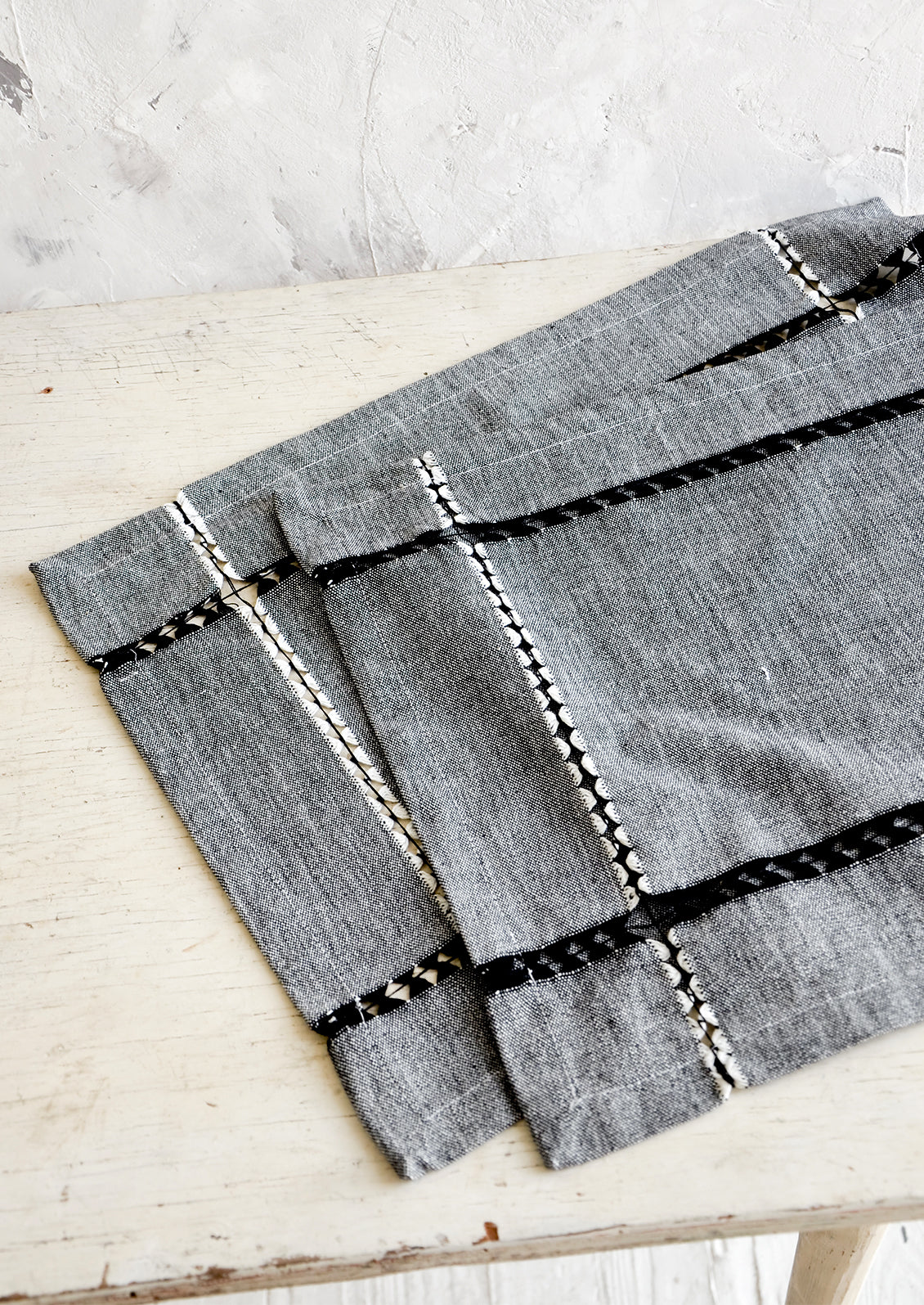 Intricate, geometric cutout detailing gives a luxe feel to these cotton placemats, crafted in classic black & white chambray.