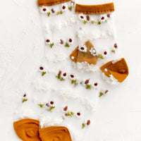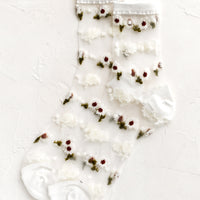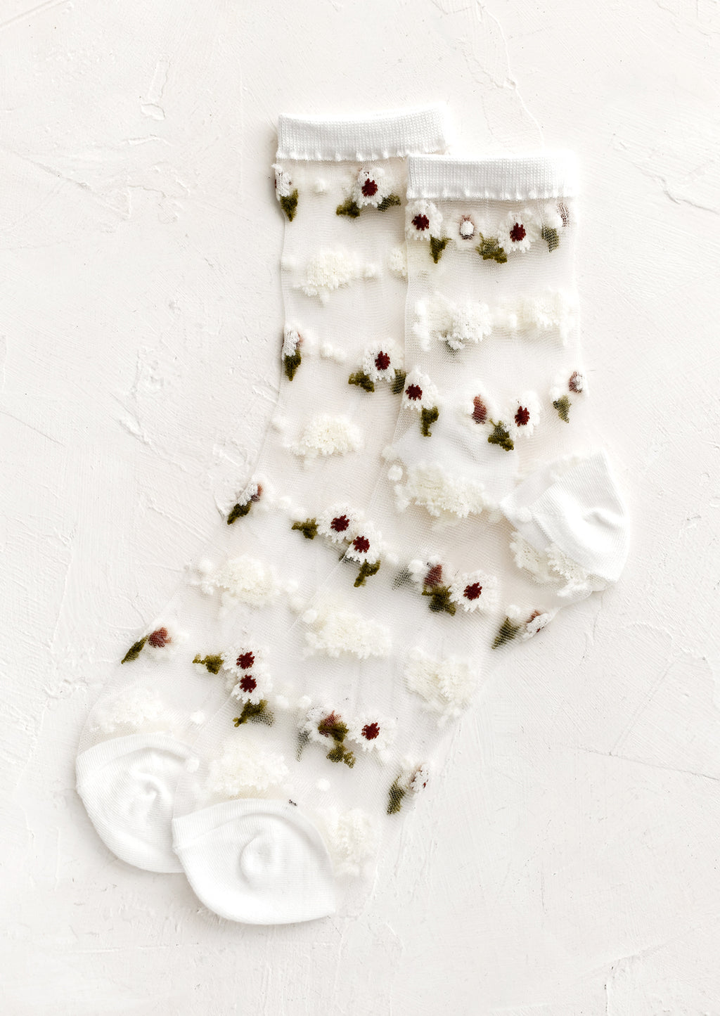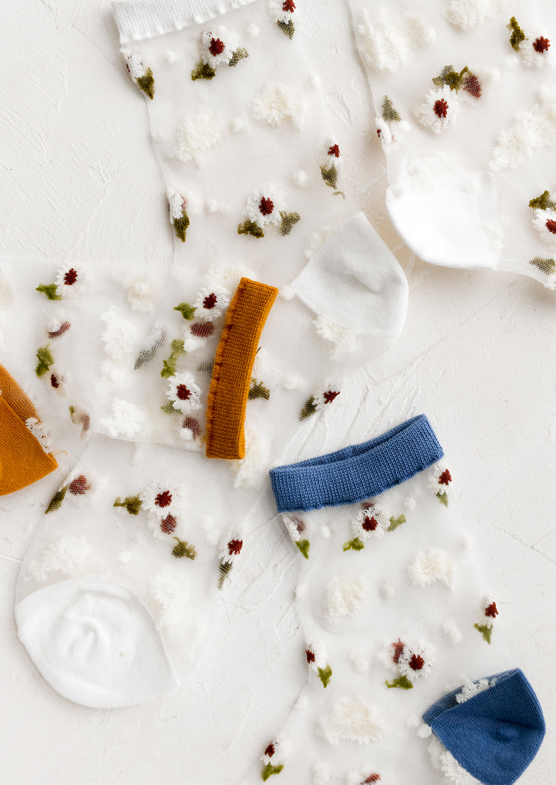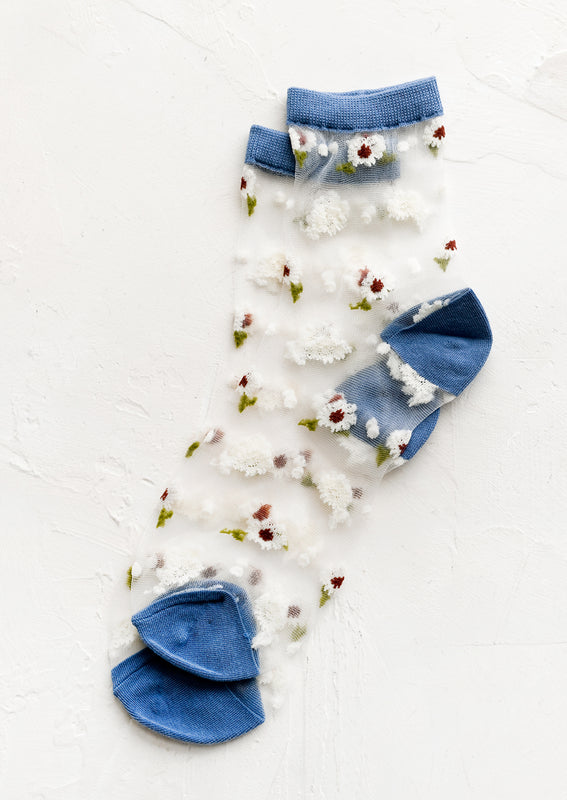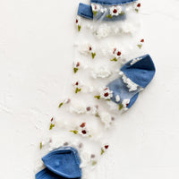 Lacy summer florals delicately detail these sheer ankle socks, offered with a subtle trim in three classic colors.