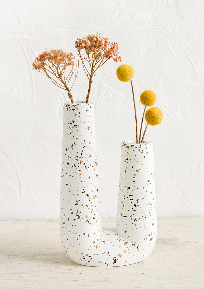 A U-shaped concrete vessel puts forth an easy-to-style, modern look, flecked with colorful terrazzo. Even when empty, it's a dreamy styling piece for a bookcase or shelf.