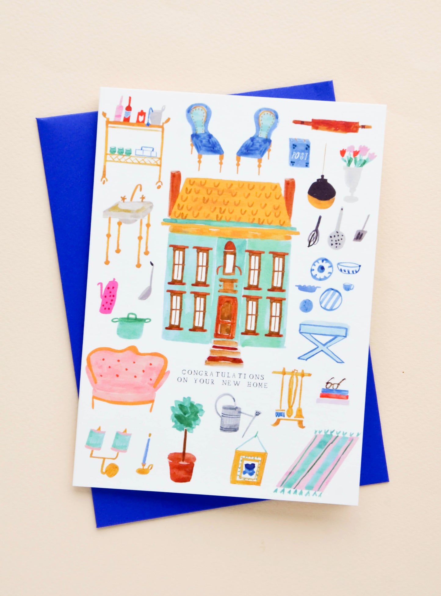 Home is where the heart is. This whimsically illustrated card paints a beautiful picture of everyday life, paired with a bright cobalt blue envelope.