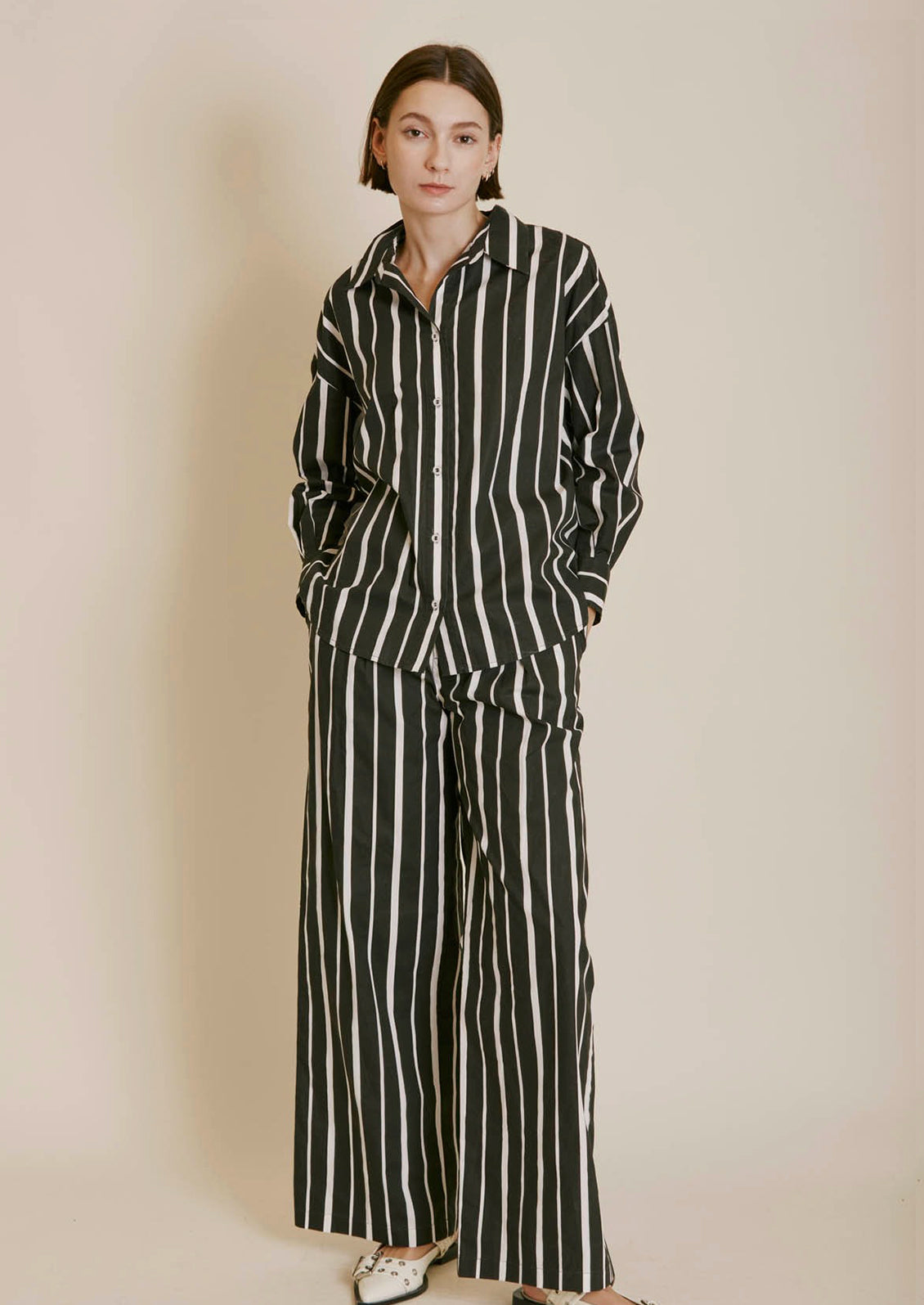 In a mid-weight, non-stretch cotton poplin, these striped pants show off a pleated silhouette. Pair it with the matching shirt for a coordinated set.