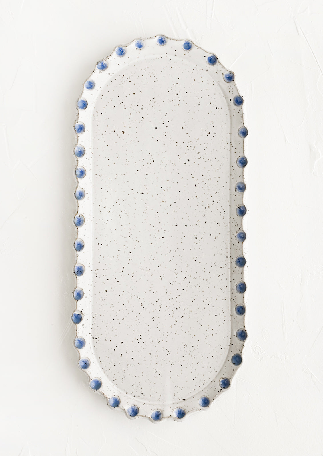 Individually made by hand by New York born-and-raised ceramicist Bari Moss, this oblong ceramic platter shows off an intricately detailed rim, exuding sophisticated playfulness.