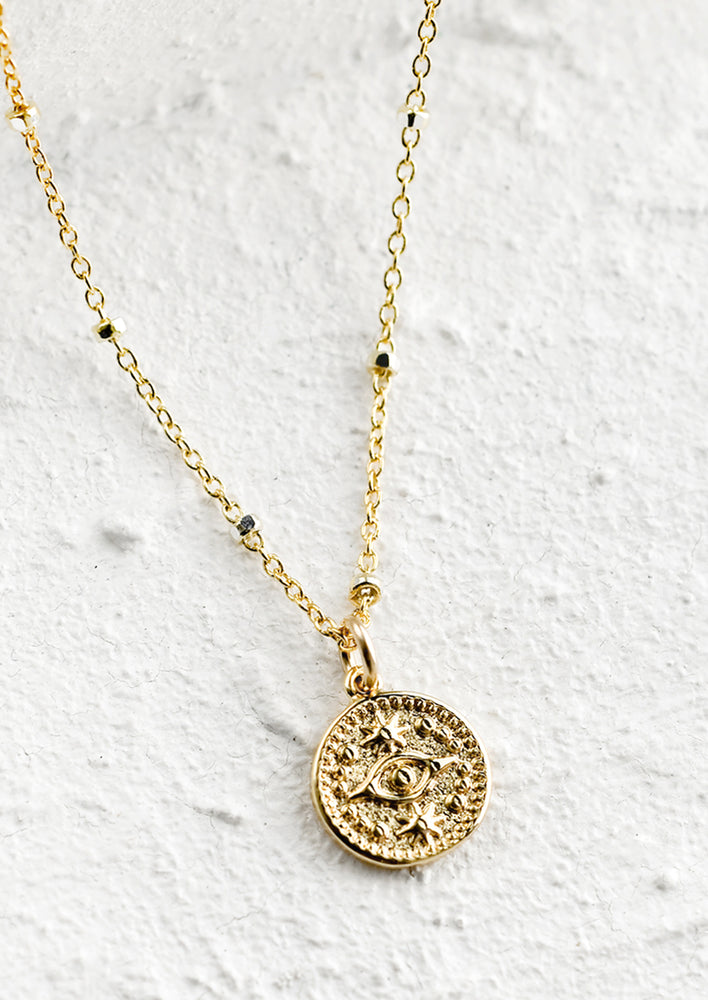 Crafted in 14k gold fill (safe to wear 24/7, even in water, without the finish wearing off), this necklace wards off negative energy with a double-sided evil eye charm.