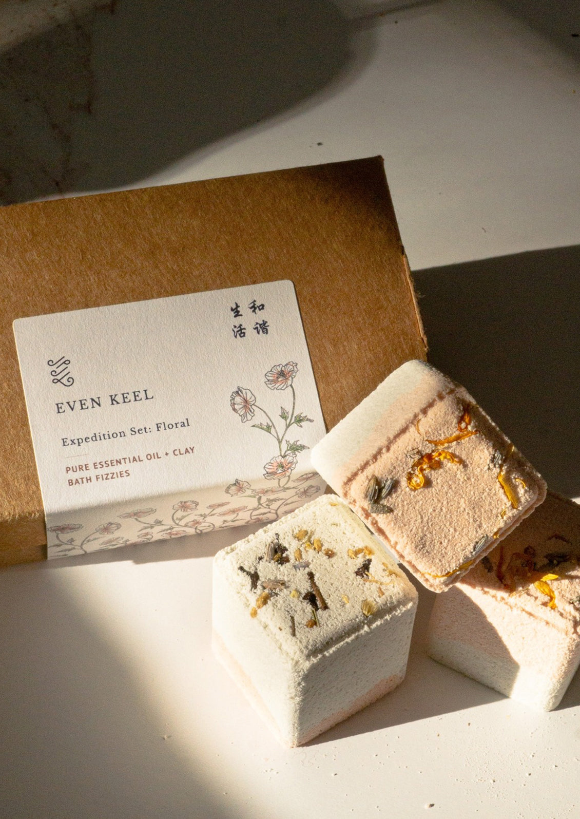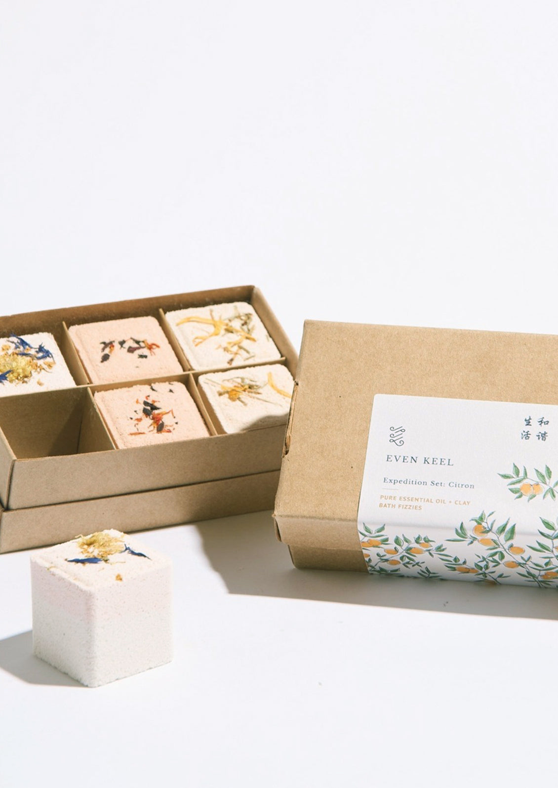 Even Keel infuses Eastern roots with Western herbs to handcraft a vegan bath & body line with a principal focus on our earth's natural clays, oils and botanicals. This highly-giftable set of six different bath fizzies includes one of each of the brand's innovative scents and ingredients.