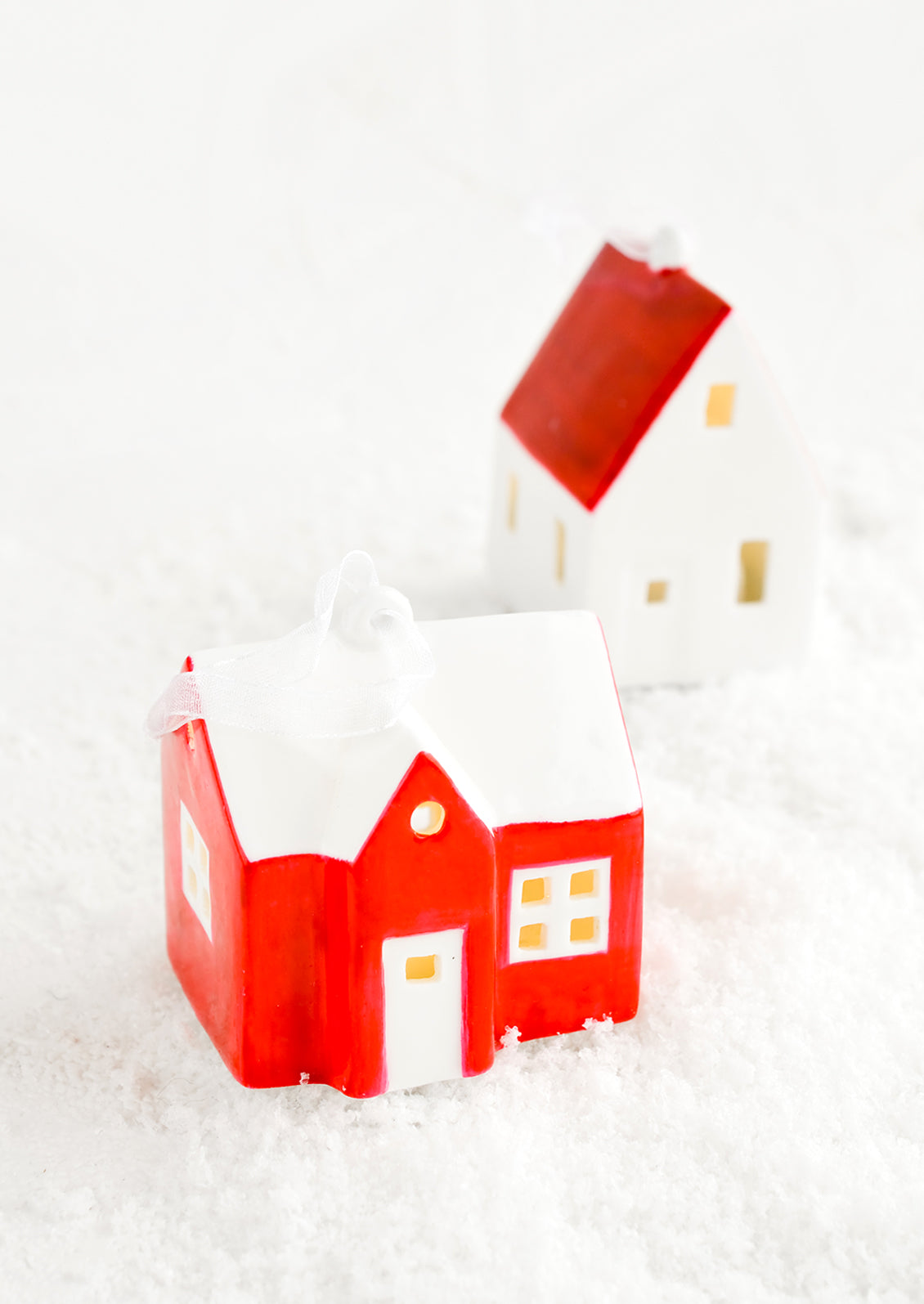 Warm interior lights glow from within these vintage farmhouse inspired ornaments, lacquered in festive red and white.