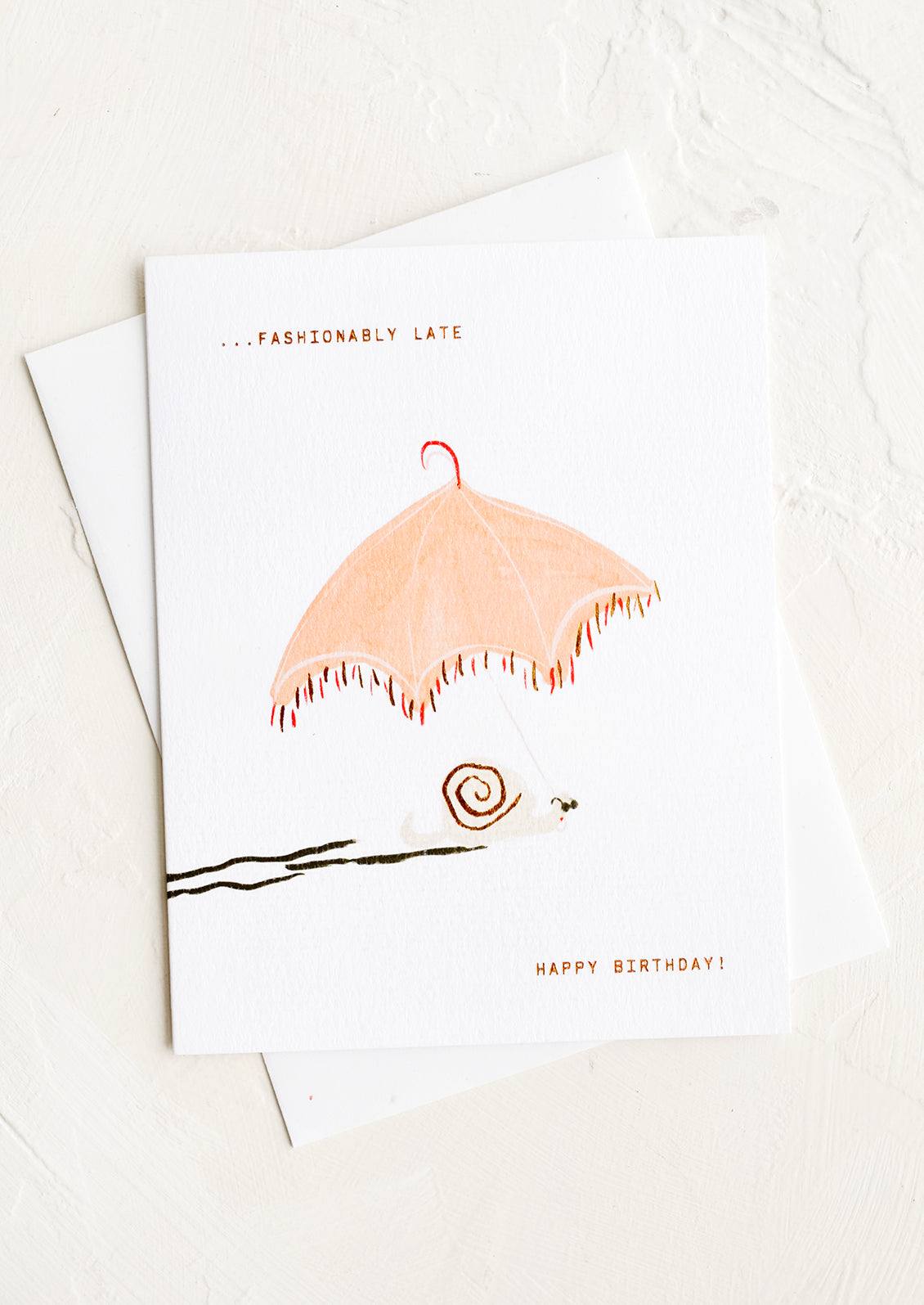 A stylish snail scoots across this charming greeting card, sure to bring about a smile despite being a little bit late!