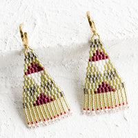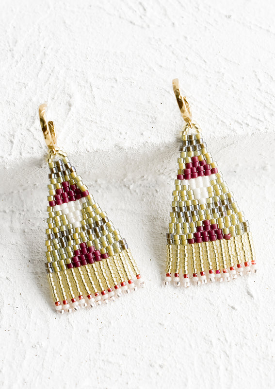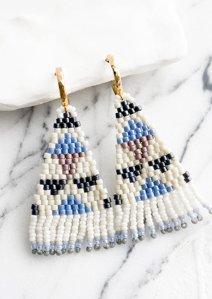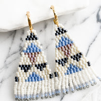 A Southwestern-inspired pattern takes form in subtly iridescent glass beads, delicately handwoven in Guatamala—dreamed up as an effortless post back silhouette on a petite hammered hoop.