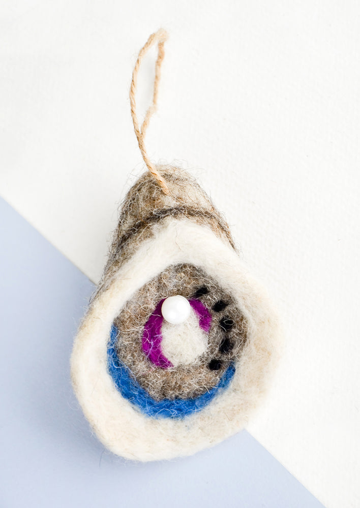 An oyster on the half shell (complete with pearl) takes form in felted wool for a natural approach to holiday decorating.