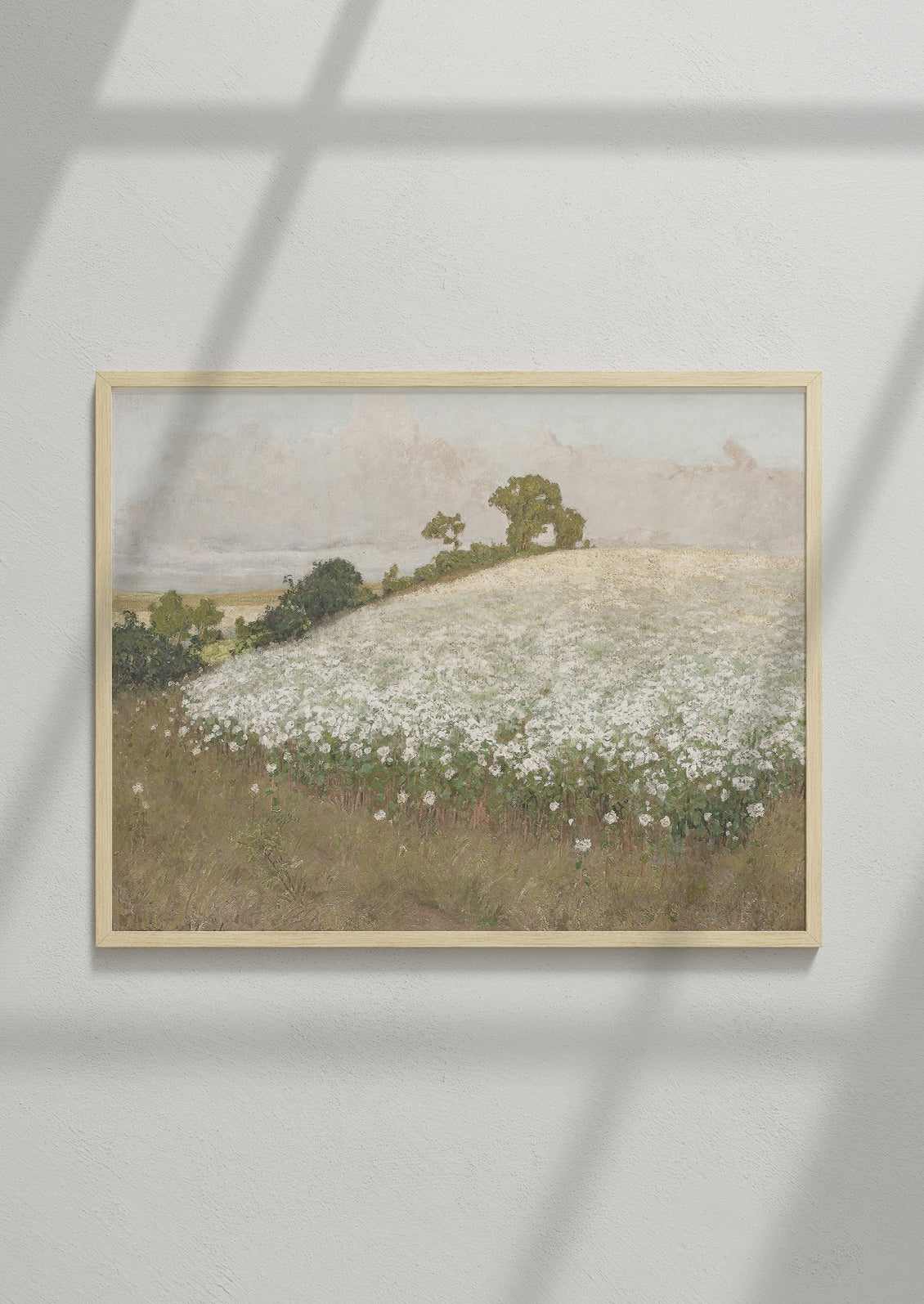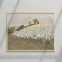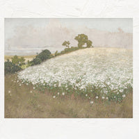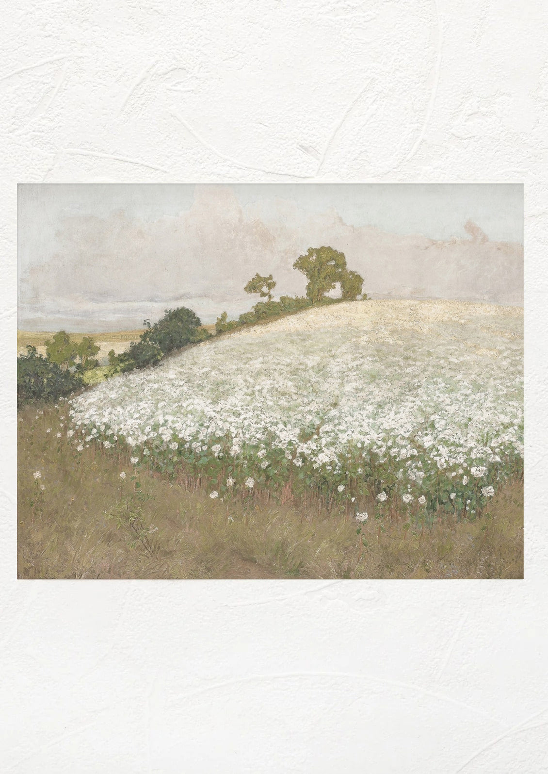 A reproduction of a vintage painting, this landscape art print depicts a whimsical, inspired scene.
