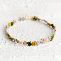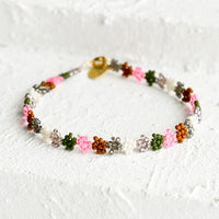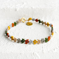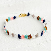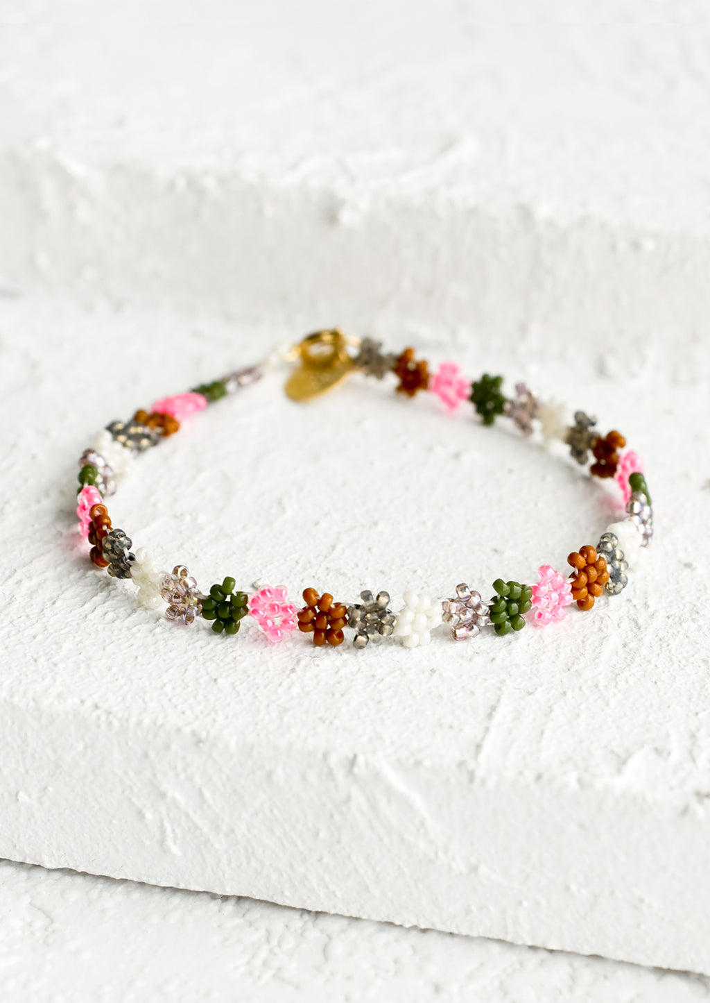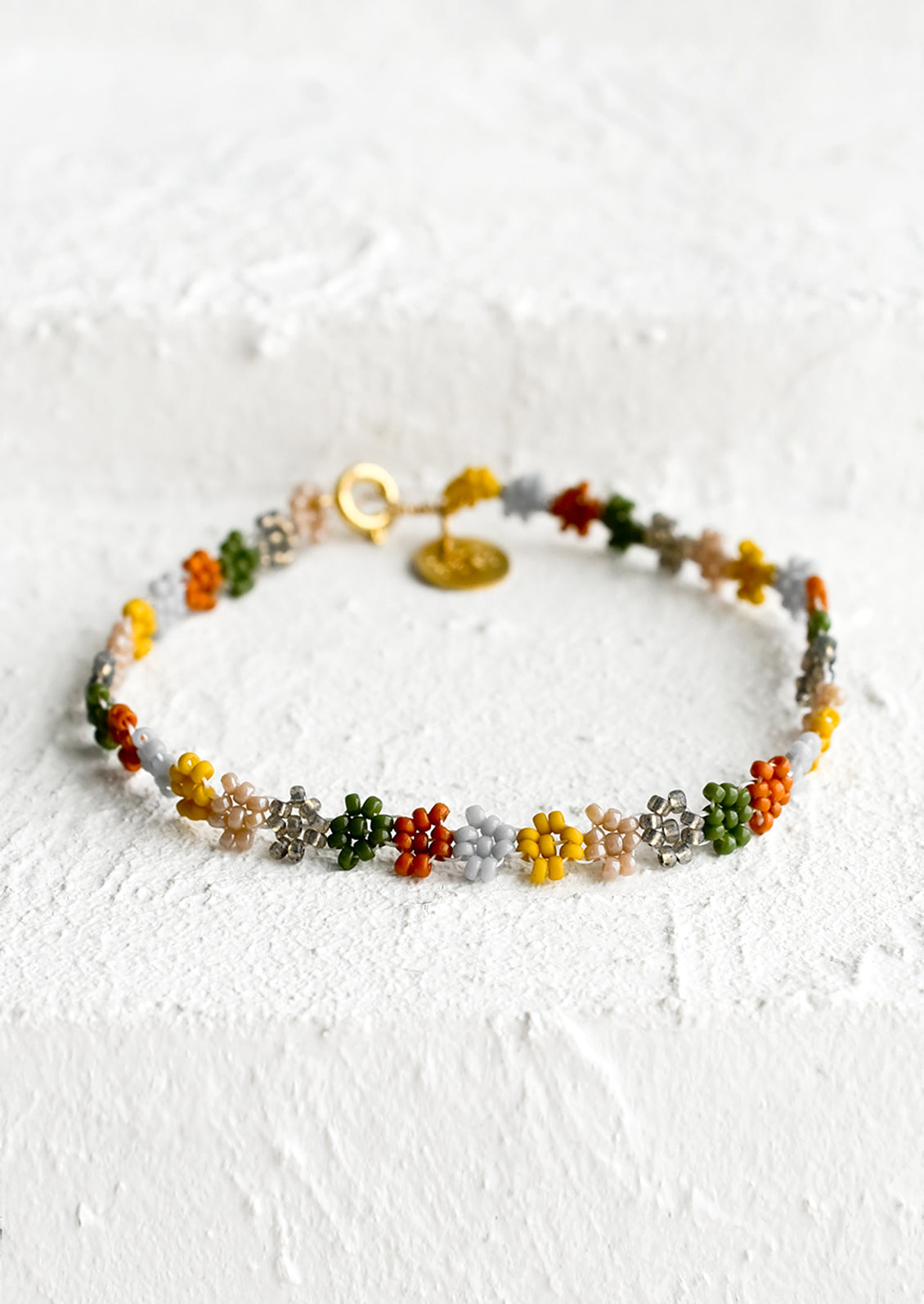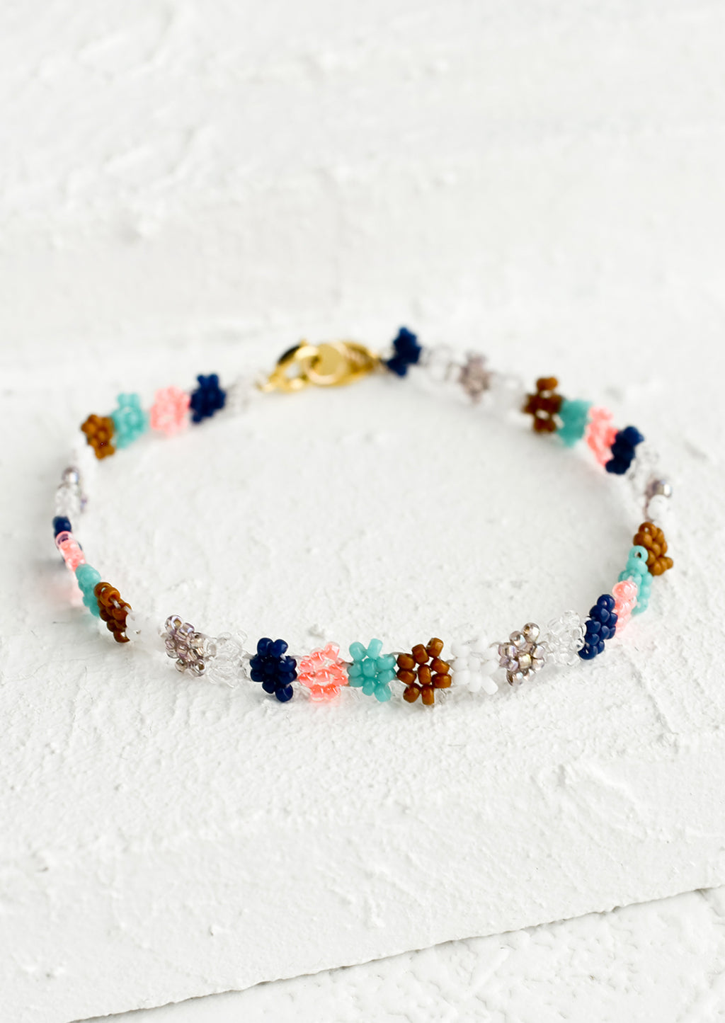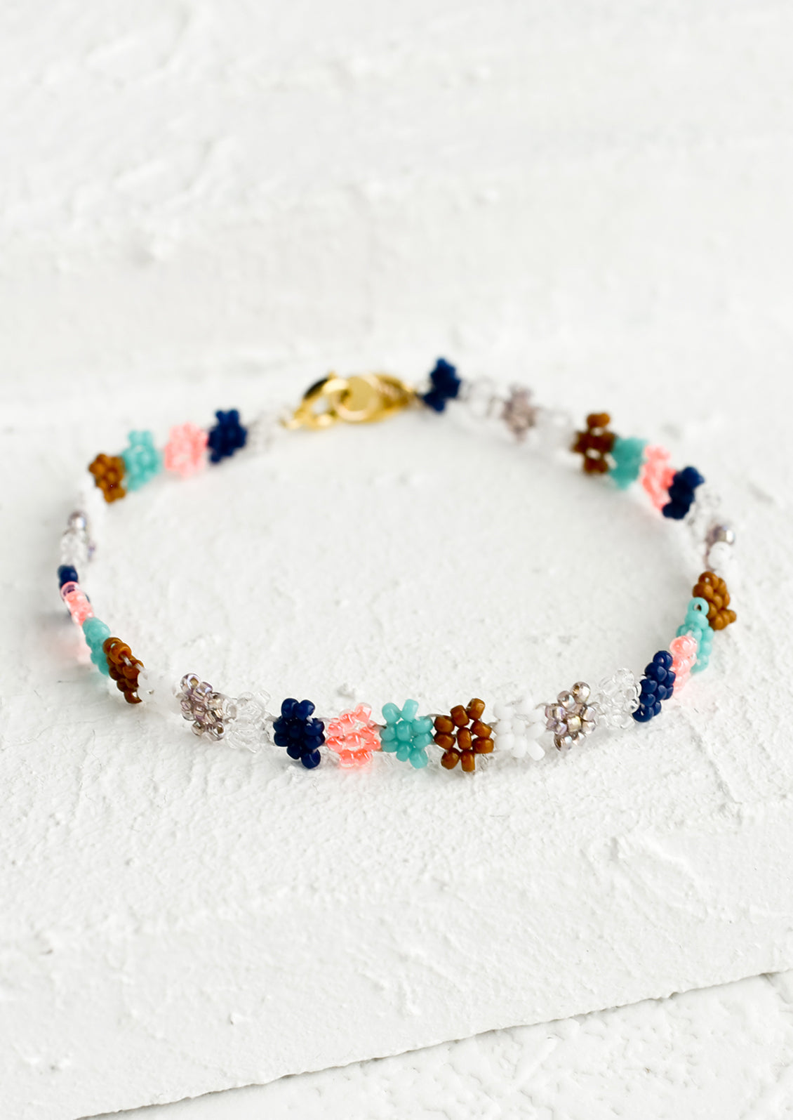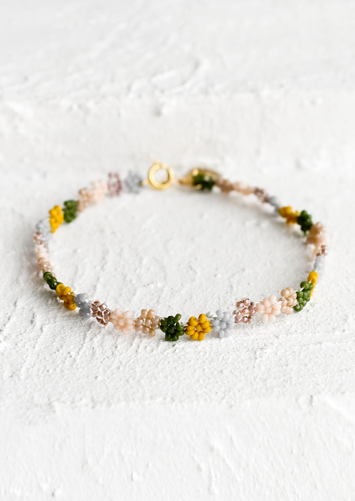 Hundreds of colorful glass beads form a chain of cheery flowers on this hand-beaded bracelet. From Bluma Project.