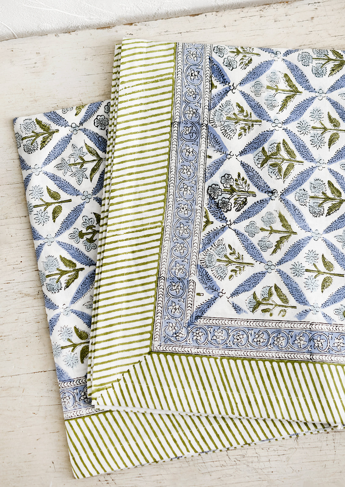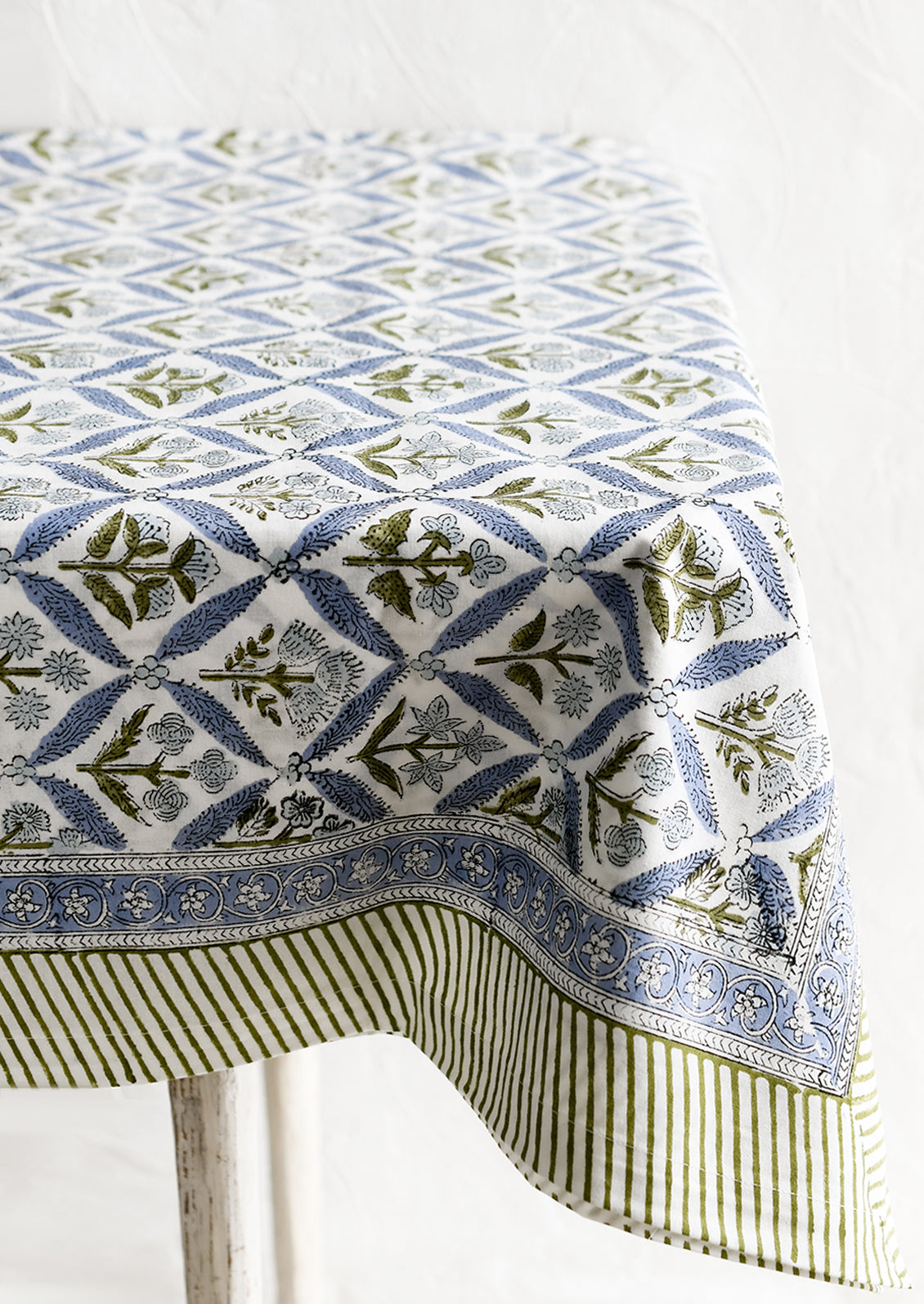 Beautifully block printed in a vintage-inspired framed floral pattern, this cotton tablecloth shows off a subtle color palette.