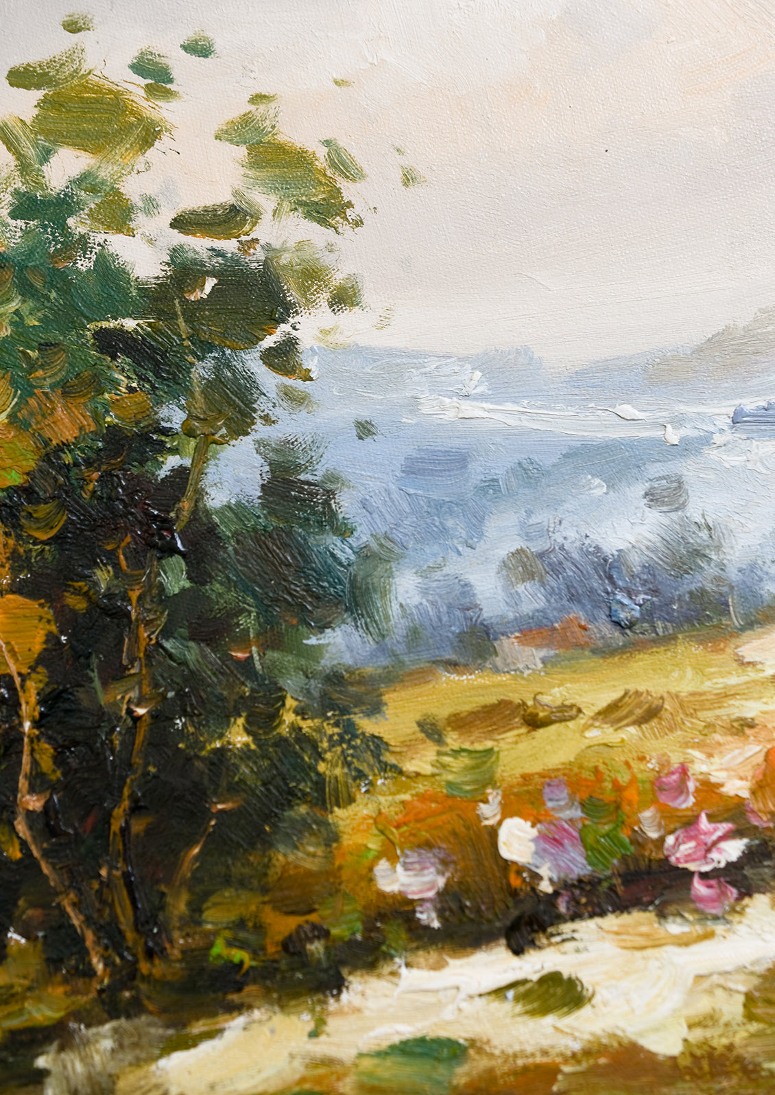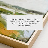 Painted in oil with thoughtful, thick brushstrokes and the perfect amount of texture, this original landscape painting shows off a rich and vibrant palette in a low-profile natural maple frame.