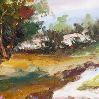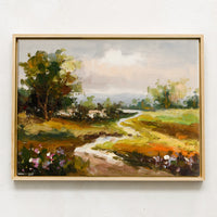 Painted in oil with thoughtful, thick brushstrokes and the perfect amount of texture, this original landscape painting shows off a rich and vibrant palette in a low-profile natural maple frame.