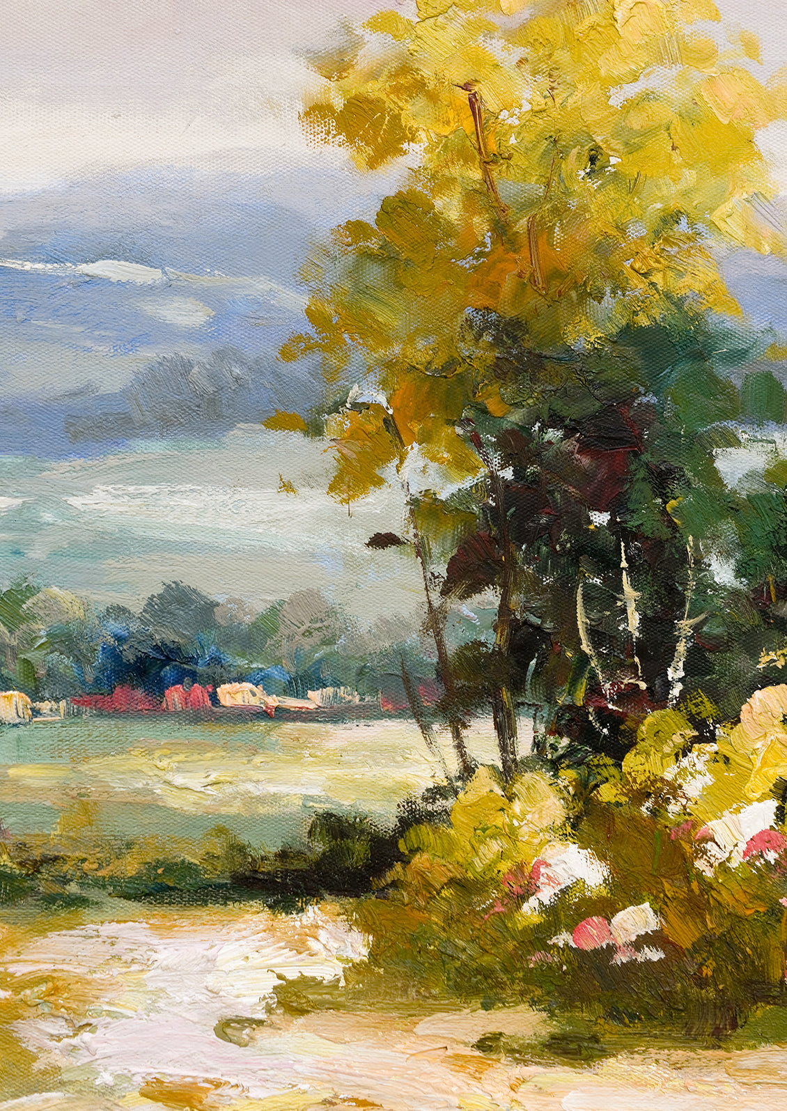 Painted in oil with thoughtful, thick brushstrokes and the perfect amount of texture, this original landscape painting shows off a rich and vibrant palette in a low-profile natural maple frame.